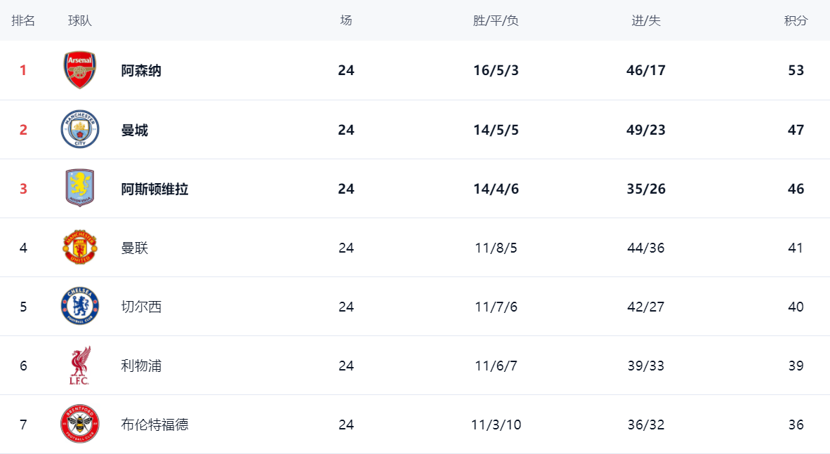 ในตารางลีก อาร์เซนอลยังคงครองตำแหน่งจ่าฝูงอย่างมั่นคงด้วย 53 คะแนน ขณะที่คู่แข่งสำคัญทั้งสองอย่างแมนเชสเตอร์ ซิตี้ และแอสตัน วิลล่า ต่างก็ทำแต้มหล่นไปแมนเชสเตอร์ ซิตี้ อยู่ในอันดับสองด้วยคะแนน 47 คะแนน ตามหลังอยู่ 6 คะแนน แอสตัน วิลล่า ยังคงอยู่ในอันดับสามด้วยคะแนน 46 คะแนน แมนเชสเตอร์ ยูไนเต็ด ได้ไต่ขึ้นมาอยู่ในตำแหน่งแชมเปียนส์ลีก อยู่ในอันดับสี่ด้วยคะแนน 41 คะแนน เชลซี อยู่ในอันดับห้าด้วยคะแนน 40 คะแนน ลิเวอร์พูล ได้ร่วงลงมาอยู่ในอันดับหกด้วยคะแนนเพียง 39 คะแนน