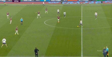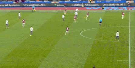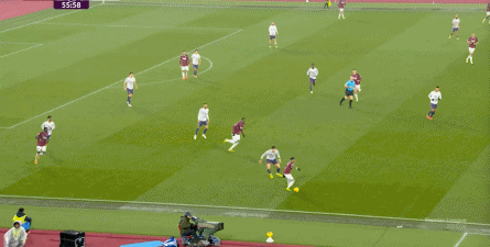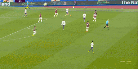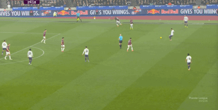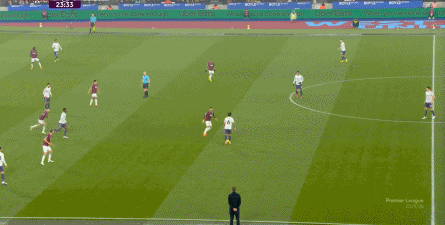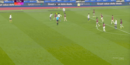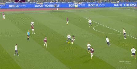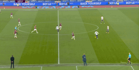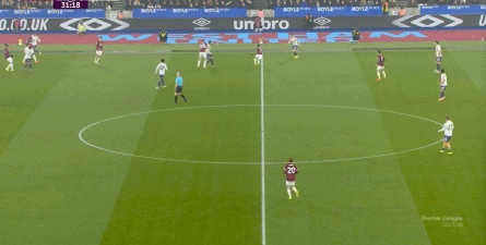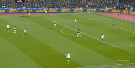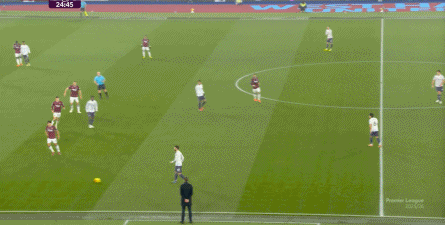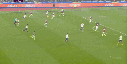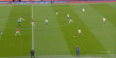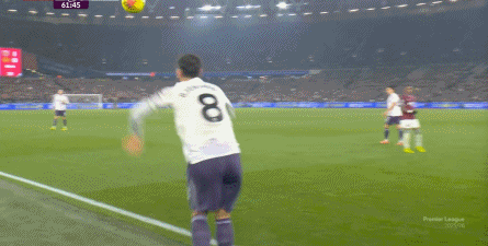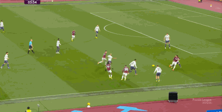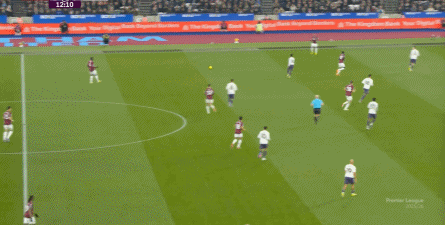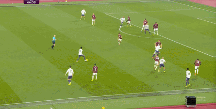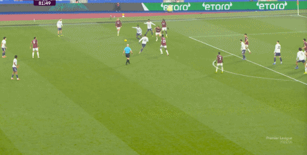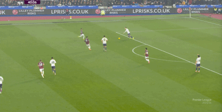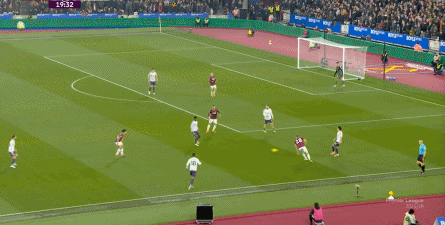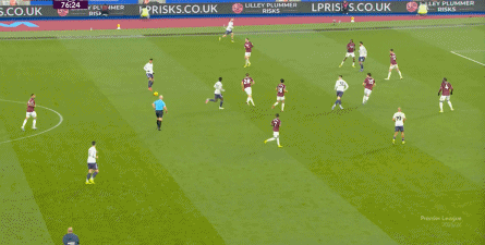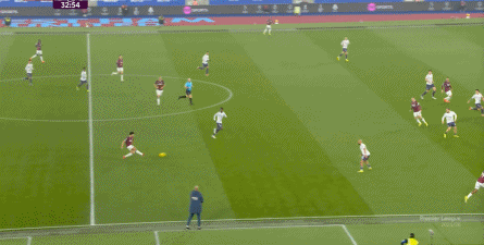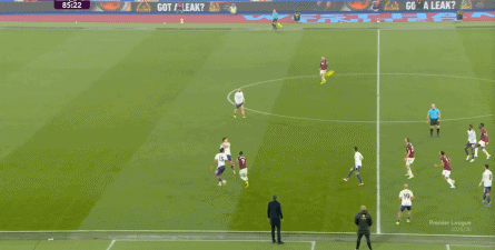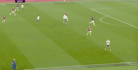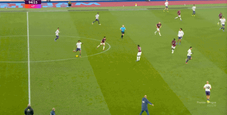 ข้อจำกัดทางร่างกายเช่นนี้ไม่ได้แสดงออกเฉพาะเมื่ออยู่ในครอบครองบอลเท่านั้น แต่ยังรวมถึงเมื่อไม่ได้ครองบอลด้วย ยกตัวอย่างการเพรสสูงนี้: มีเพียงบรูโน่เท่านั้นที่เข้าไปมีส่วนร่วมอย่างมีประสิทธิภาพ ทำให้กองหลังเวสต์แฮมสามารถเงยหน้าขึ้นมองก่อน จากนั้นจึงตั้งสติเล็งและยิงได้อย่างเยือกเย็น กลายเป็นจังหวะที่โบเวนและเพื่อนร่วมทีมได้ฟรีคิกในแดนคู่แข่งลึกเข้าไปอีก