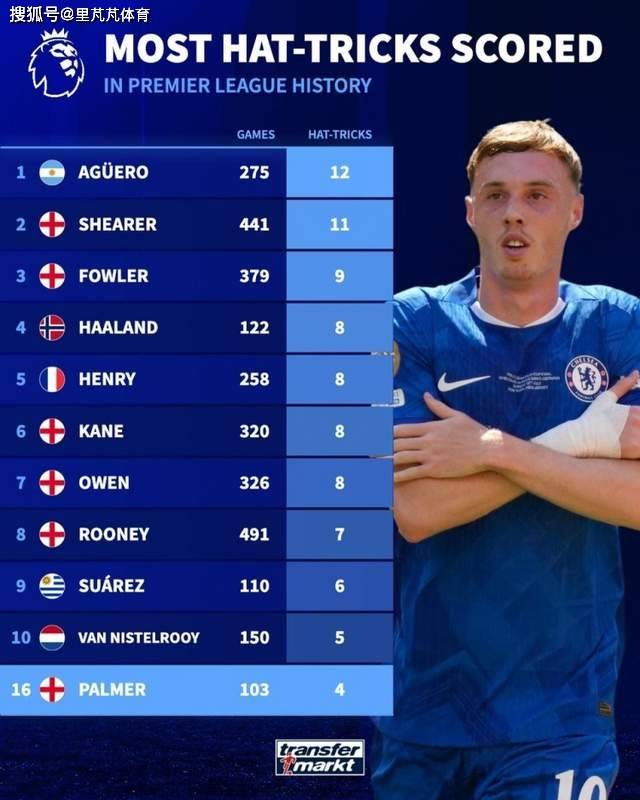1 - สถิติจาก Transfermarkt: พาลเมอร์ทำแฮตทริกในพรีเมียร์ลีกได้ 4 ครั้งแล้ว ทำให้เขาอยู่ในอันดับที่ 16 ร่วมในสถิติตลอดกาล