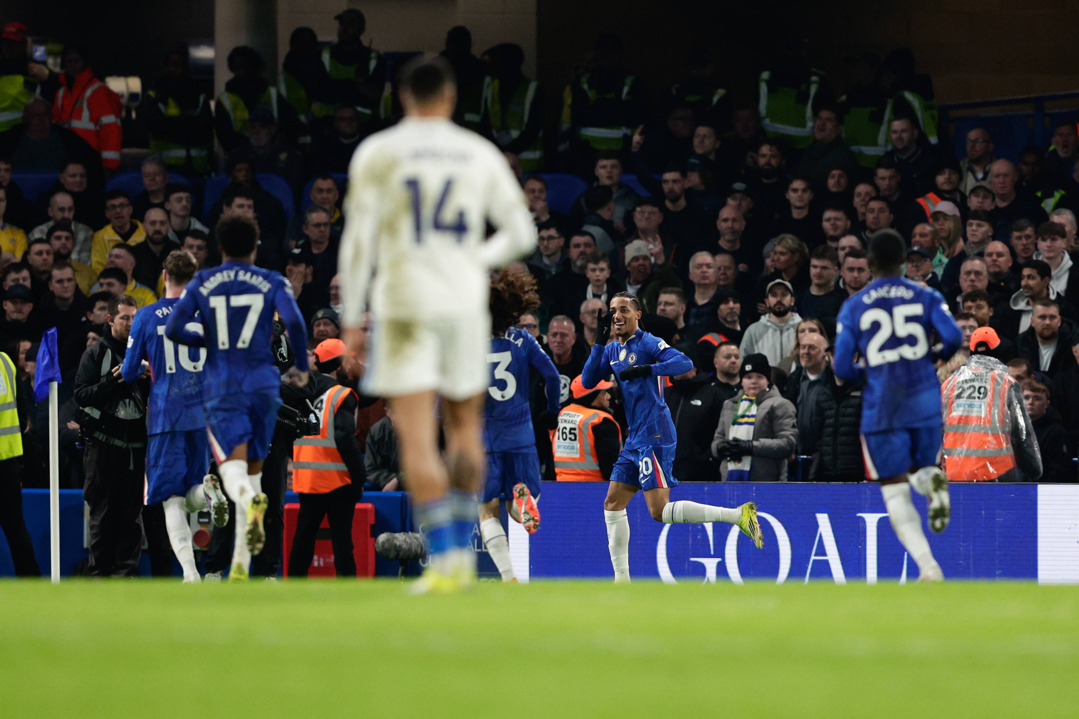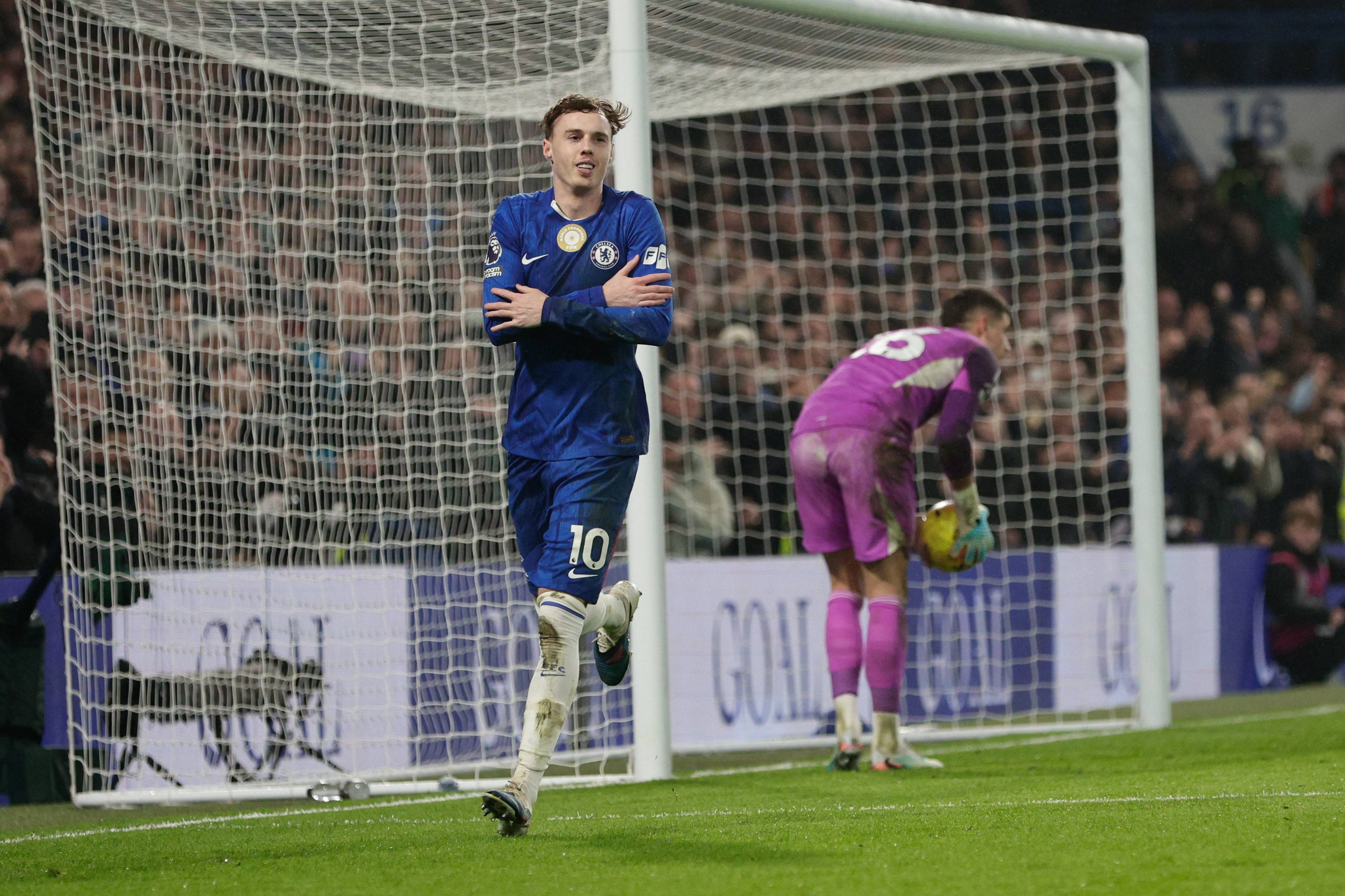 เมื่อวันที่ 10 กุมภาพันธ์ เมสัน พาลเมอร์ (ซ้าย) นักเตะเชลซี ฉลองการทำประตูที่สองของทีม Xinhua/EPA