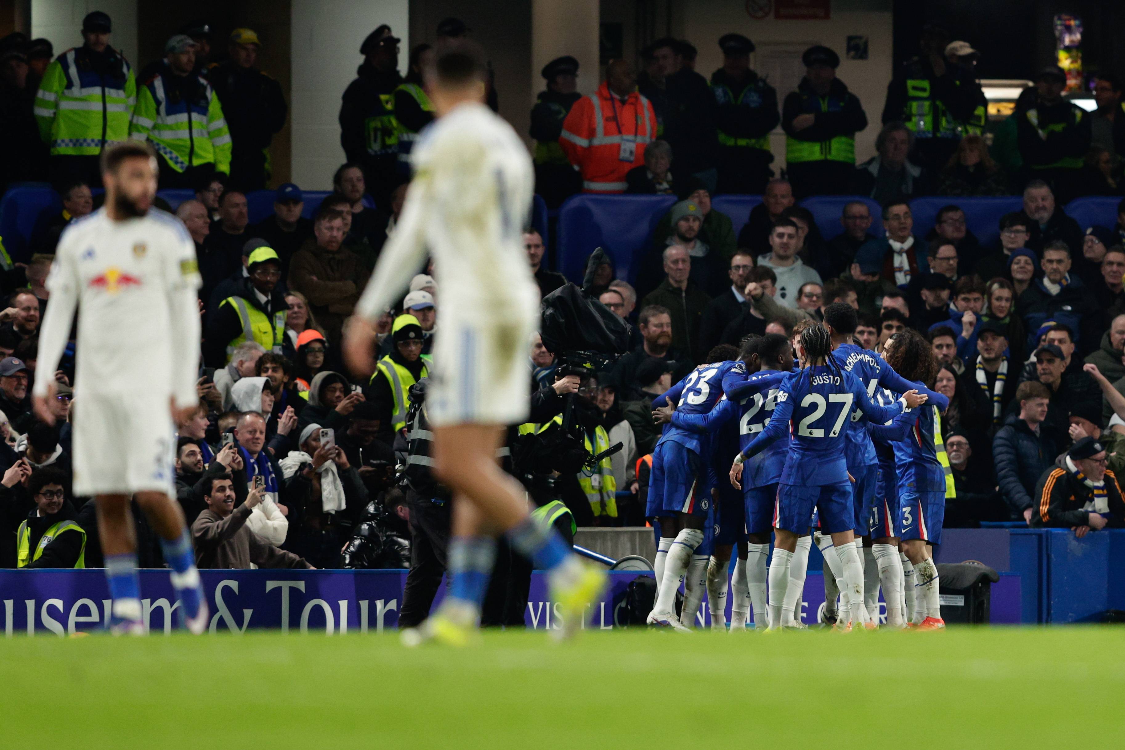 เมื่อวันที่ 10 กุมภาพันธ์ เปโดรของเชลซี (ขวา) เข้าปะทะกับจัสตินของลีดส์ ยูไนเต็ด เพื่อแย่งบอล. ซีเอ็นเอ็น/อีพีเอ
