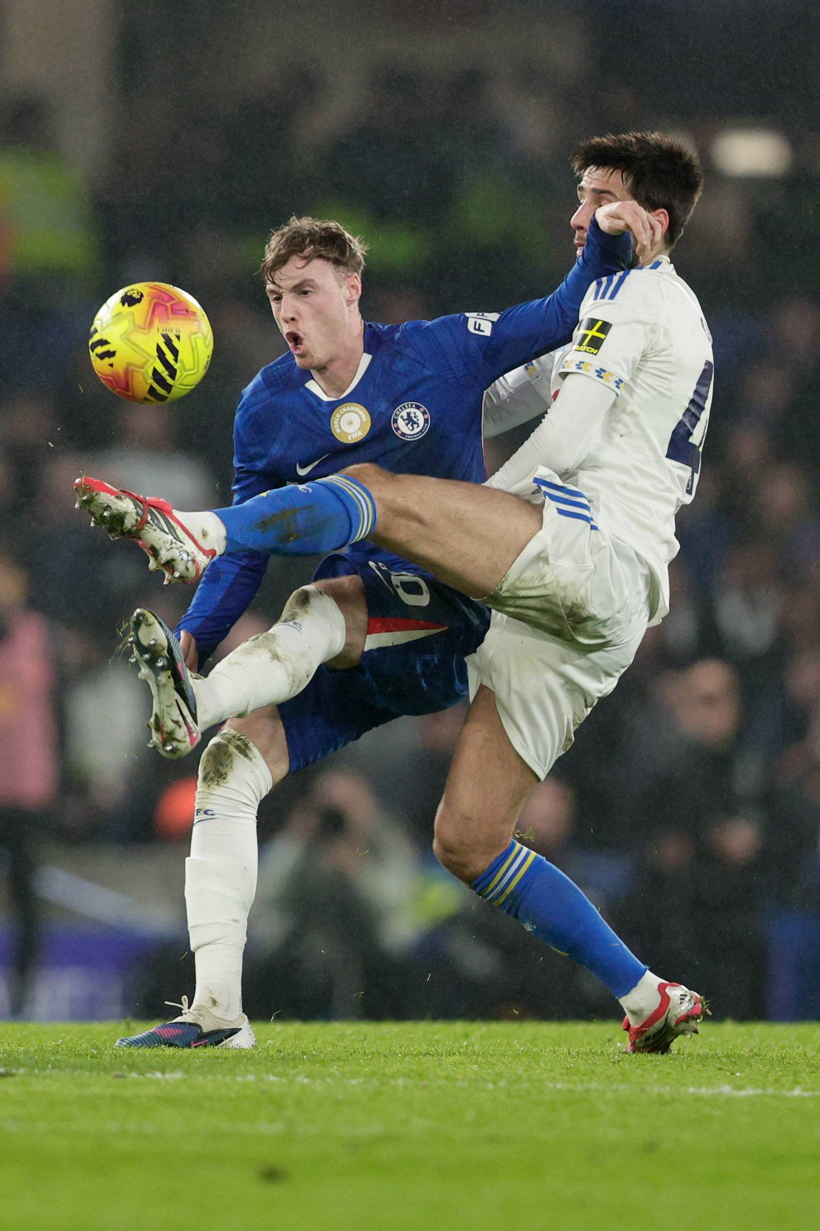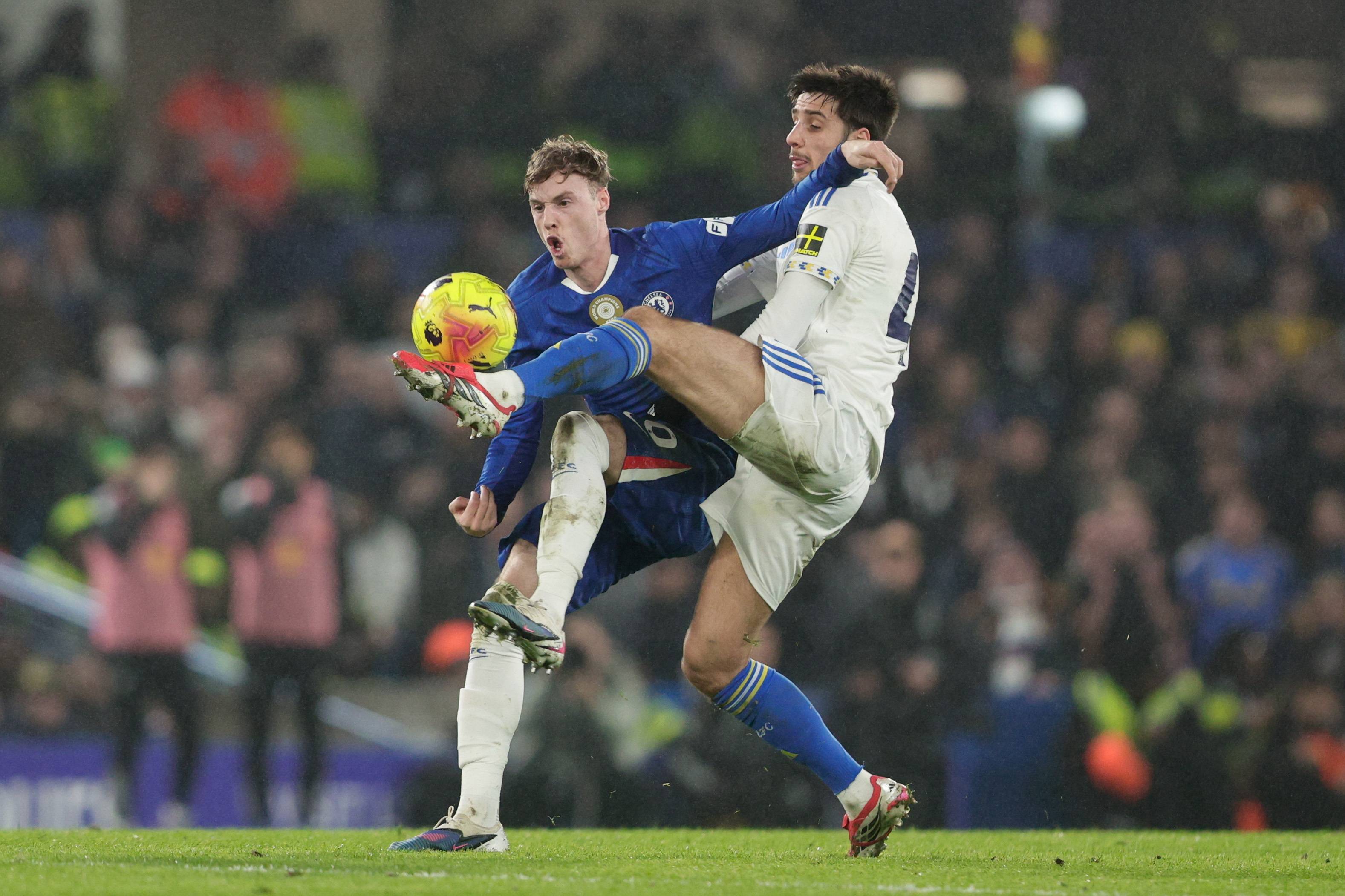 เมื่อวันที่ 10 กุมภาพันธ์ เมสัน พาล์เมอร์ ของเชลซี (ซ้าย) เข้าปะทะกับ อีวาน กรูเอฟ ของลีดส์ ยูไนเต็ด ระหว่างการแข่งขัน ซินหัว/EPA