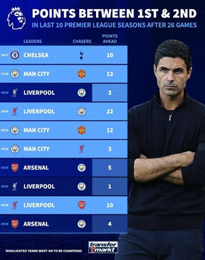 เพื่อเป็นการตอบสนอง Transfermarkt ได้รวบรวมช่องว่างคะแนนระหว่างสองทีมอันดับสูงสุดหลังจาก 26 นัดในพรีเมียร์ลีกตลอดสิบฤดูกาลที่ผ่านมา ทีมที่นำเป็นอันดับหนึ่งซึ่งถูกเน้นในตารางสุดท้ายได้คว้าแชมป์ไปครอง ในขณะที่ทีมอันดับสูงสุดต้องเสียแชมป์ไปสามครั้ง ซึ่งรวมถึงฤดูกาล 2022-23 ที่อาร์เซนอลมีคะแนนนำแมนเชสเตอร์ซิตี้อยู่ห้าคะแนน แต่สุดท้ายก็พลาดแชมป์ไป