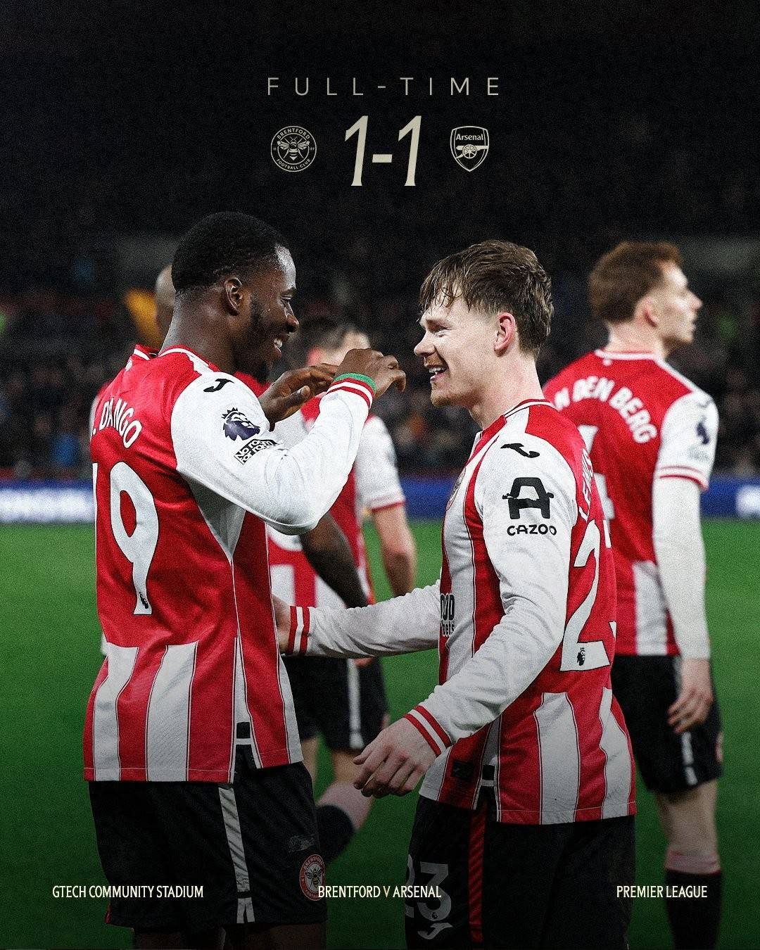ในรอบที่ 26 ของพรีเมียร์ลีก เบรนท์ฟอร์ดเสมอกับอาร์เซนอล 1-1 แม้ว่าจะครองเกมได้เหนือกว่าก็ตาม ผลการแข่งขันนี้ทำให้อาร์เซนอลนำเป็นจ่าฝูงของตารางพรีเมียร์ลีกลดลงเหลือ 4 คะแนน ทำให้การแข่งขันชิงแชมป์กลับมาเข้มข้นอีกครั้ง