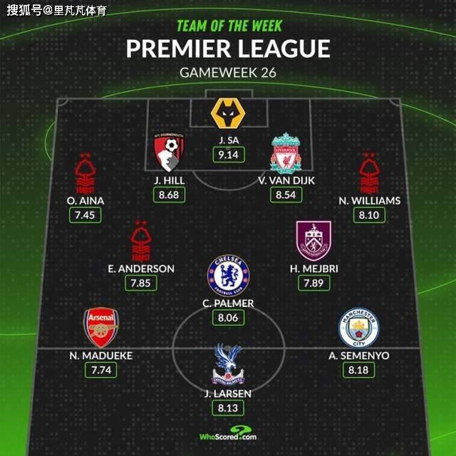 Whoscored ได้รวบรวมและคัดเลือกทีมยอดเยี่ยมประจำสัปดาห์ของพรีเมียร์ลีกน็อตติงแฮม ฟอเรสต์ กลายเป็นทีมที่ประสบความสำเร็จมากที่สุด โดยมีผู้เล่นสามคน ได้แก่ เอนาม, เนโก วิลเลียมส์ และเอลเลียต แอนเดอร์สัน ได้รับเลือก ทีมทั้งหมดมีดังนี้: ผู้รักษาประตู: โจเซ่ ซา (วูล์ฟแฮมป์ตัน วันเดอเรอร์ส); กองหลัง: เอนาม (น็อตติงแฮม ฟอเรสต์), เจมส์ ฮิลเลียร์ (บอร์นมัธ), เวอร์จิล ฟาน ไดจ์ค (ลิเวอร์พูล), เนโก วิลเลียมส์ (น็อตติงแฮม ฟอเรสต์);กองกลาง: เอลเลียตต์ แอนเดอร์สัน (น็อตติงแฮม ฟอเรสต์), พาลเมอร์ (เชลซี), ฮันนิบาล เมจบรี้ (เบิร์นลีย์); กองหน้า: มาดูเอเก้ (อาร์เซนอล), ลาร์เซน (คริสตัล พาเลซ), เซเมโญ่ (แมนเชสเตอร์ ซิตี้)