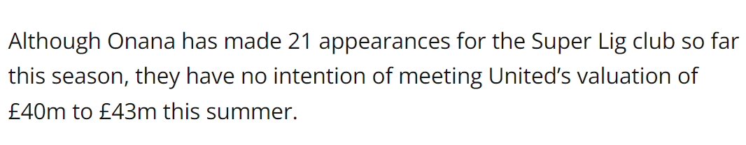 ผู้บริหารระดับสูงของทีม Trabzon Sports เปิดเผยว่าแมนเชสเตอร์ยูไนเต็ดได้ยืมตัว Andre Ona ผู้รักษาประตูของทีมในฤดูกาลนี้ด้วยราคา 45 ล้านยูโรถึง 50 ล้านยูโร (40 ล้านถึง 43 ล้านปอนด์) ดังนั้นพวกเขาจะไม่ซื้อจากเขาในฤดูร้อนนี้ Ona จะกลับมาที่ Red Devils ในเดือนกรกฎาคม
