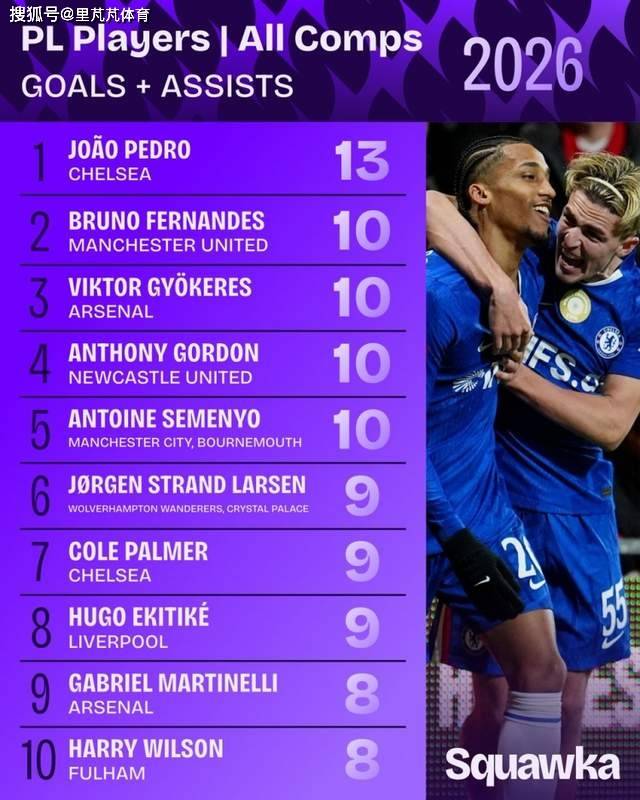หน่วยงานข้อมูล Squawka นับการมีส่วนร่วมของผู้เล่นพรีเมียร์ลีกในกิจกรรมต่างๆ ตั้งแต่ปี 2026 (เป้าหมาย + ผู้ช่วย) และรายการ โจอา เปโดร กองหน้าเชลซี ทำผลงานได้ 13 ประตู กองหน้าตัวเอกของ แมนฯ ยูไนเต็ด บี เฟย กองหน้า อาร์เซนอล โยเครส กอร์ดอน ปีกตัวเก่ง นิวคาสเซิ่ล ยูไนเต็ด เซเมนิโอ ปีกดาวรุ่งของแมนเชสเตอร์ ซิตี้ ทั้งคู่ร่วมลุ้นกันใน 10 ประตูหลัง