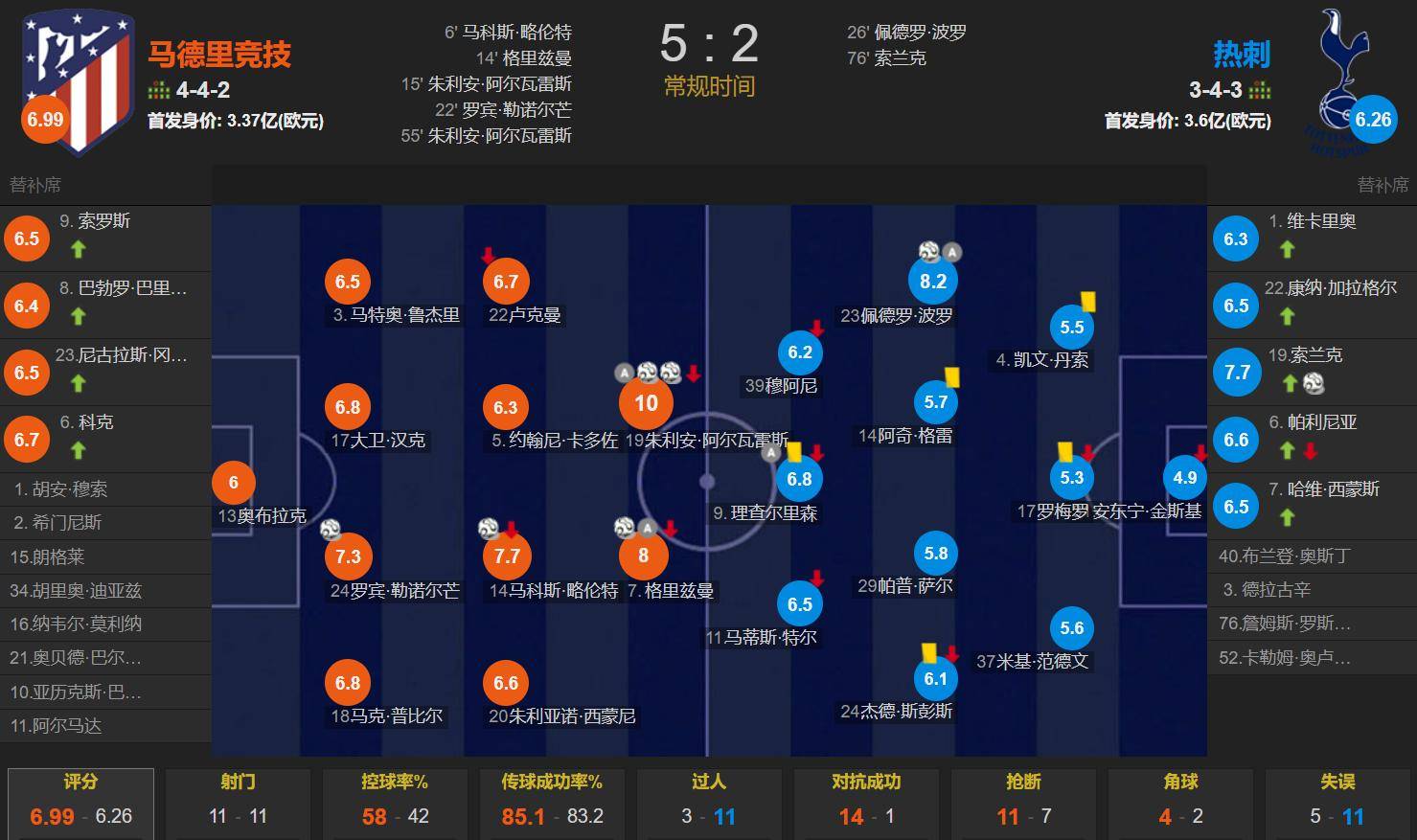 อัตเลติโก vs ท็อตแนม ทีมซิโมนิใน 442 กลุ่ม กรีซมันน์และอัลวาเรซสร้างคู่หน้า, ซีโมน, llorente, cardolsu และลูกาแมนฟอร์มกลางสี่กองกลาง, pubir, le normang, hantsko, และ lugerri ฟอร์มสี่หลัง, oubrag rogrop rog rog rog rog และเริ่มต้นมีค่า 3.7 พันล้านยูโร; Tudor มี 3433 รูปแบบหลัง, 3.7 พันล้านยูโร