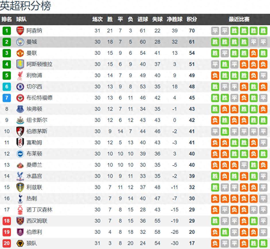 - 曼城:积61分,最近3次丢分都是面对保级球队,分别与热刺、诺丁汉森林、西汉姆联战平,曼城已经沦为掉链子之王,争冠已经彻底掉队。