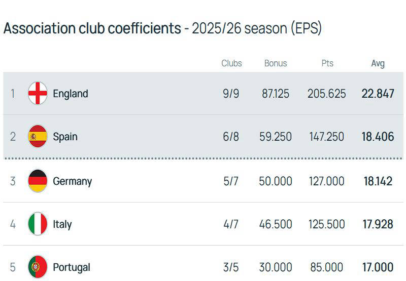 ตามอันดับล่าสุดของยูฟ่า แม้ว่าสถานะโดยรวมของพรีเมียร์ลีกจะซบเซา แต่ก็ยังอยู่ในอันดับที่หนึ่งในการจัดอันดับคะแนนในฤดูกาลเดียว แม้ว่าพรีเมียร์ลีกจะนำจาก 5 แต้มในตอนท้ายของลีกเป็น 4.4 แต้มแม้ว่าทั้ง 9 ทีมจะตกรอบ แต่ความน่าจะเป็นที่พรีเมียร์ลีกจะแพ้ตำแหน่งแรกก็ยังต่ำมาก นับประสาถูกแซงหน้าสองลีกหลักในเวลาเดียวกัน ส่งผลให้พรีเมียร์ลีกล็อคตำแหน่งสองอันดับแรกเพื่อให้แน่ใจว่าพวกเขาจะได้รับรางวัลหลายรางวัลในแชมเปี้ยนส์ลีก นอกจากนี้ อันดับที่ 5 ในพรีเมียร์ลีกจะยังคงผ่านเข้ารอบแชมเปี้ยนส์ลีกในฤดูกาลหน้า คาดว่า แมนฯ ยูไนเต็ด, แอสตัน วิลล่า, ลิเวอร์พูล และ เชลซี จะแข่งขันกันอย่างดุเดือดเพื่อชิงแชมป์ลีกสามนัด