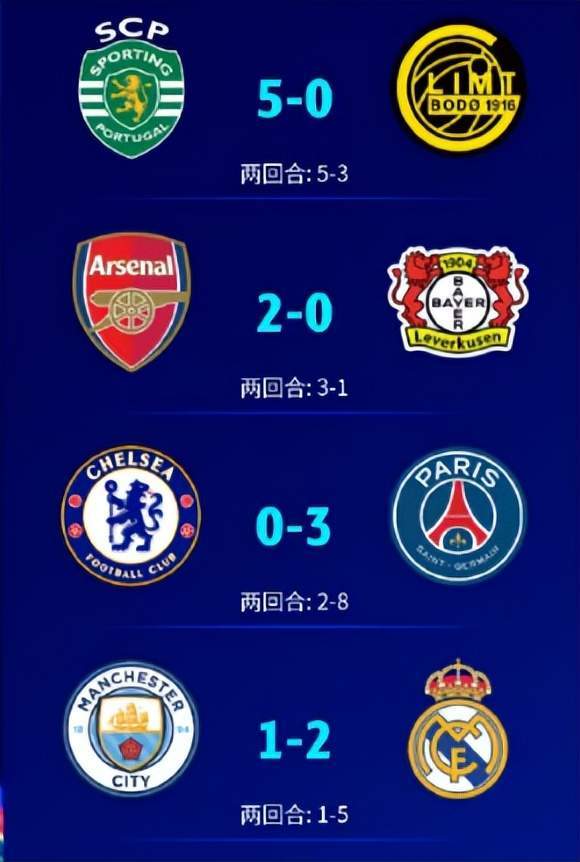 คะแนนโดยรวมมีดังนี้ เรอัล มาดริด เอาชนะ แมนฯ ซิตี้ ไป 2-1 และสกอร์รวมเป็น 5-1 กำจัดคู่ต่อสู้ เปแอสเชเอาชนะเชลซีไป 3-0 และสกอร์รวมเป็น 8-2 บุกไปก่อน มันเป็นความโกลาหลและเชลซีแพ้ทุกหน้า อาร์เซนอล เอาชนะ เลเวอร์คูเซ่น 2-0 ในบ้าน บุกไป 3-1 เซฟหน้าพรีเมียร์ลีก สิ่งที่โชคร้ายที่สุดคือ Bode เปล่งประกาย นำ 3-0 ในรอบแรก และรอบที่สองของเกมเยือนนั้นจริง ๆ แล้วเป็นความล้มเหลว 0-5 และออกจาก 3-5 โดยตรง ทำให้กีฬาโปรตุเกสสามารถย้อนกลับและปรับปรุงได้