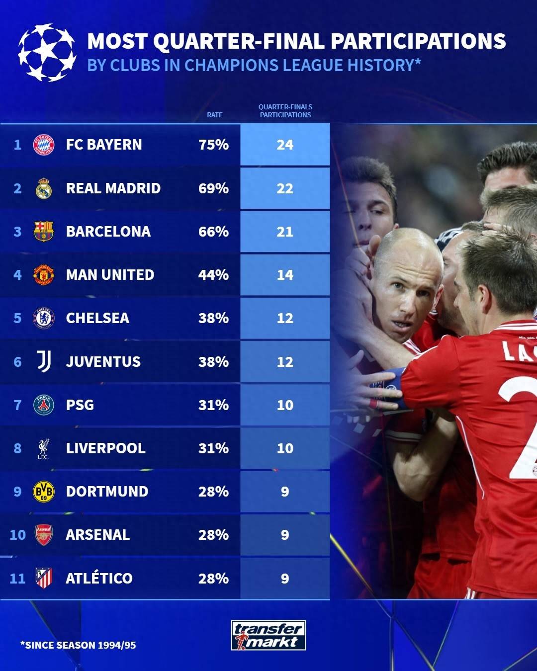 รอบก่อนรองชนะเลิศแชมเปี้ยนส์ลีก 2025-26 ได้จบลงแล้ว และ 8 อันดับแรกก็ถูกผลิตขึ้นด้วย โดยมีทีมลาลีกา 3 ทีม, พรีเมียร์ลีก 2 ทีม และ 1 ทีมในบุนเดสลีกาและโปรตุเกสซูเปอร์ลีก ในเรื่องนี้ เยอรมนีได้ระบุจำนวนทีมในรอบรองชนะเลิศแชมเปี้ยนส์ลีกตั้งแต่ฤดูกาล 1994-95 ส่งผลให้ยักษ์ใหญ่ทั้งสามของหวงซาเรนอยู่ข้างหน้า บรรพบุรุษของแมนเชสเตอร์ ยูไนเต็ด รวยที่สุด