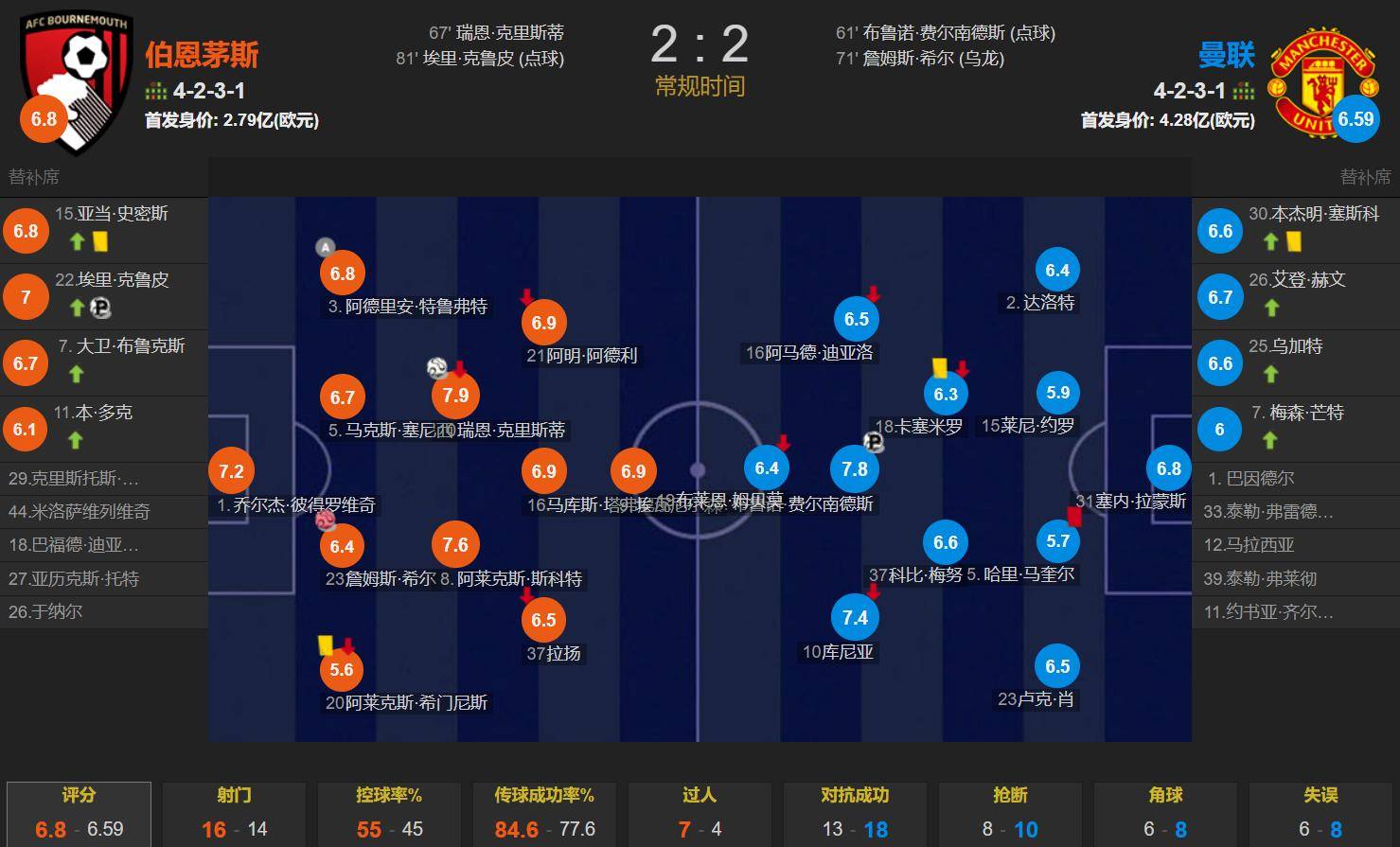 ในเกมทั้งหมด อัตราการครองบอลของบอร์นมัธอยู่ที่ 55% และมีทั้งหมด 16 นัด มากกว่าแมนเชสเตอร์ ยูไนเต็ด 2 ครั้ง และทั้งสองฝ่ายอยู่ในเป้าหมาย ข้อพิพาทและโทษของผู้ตัดสินทำให้เกิดการโต้เถียง แต่ทั้งสองฝ่ายเล่นได้ดีเสมอกัน