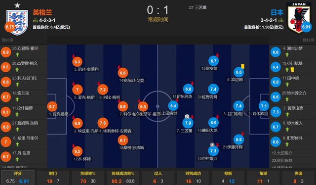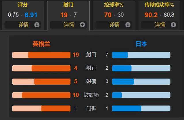 แม้ว่าทีมชาติอังกฤษหลังจากปกปิดบอลครองบอลคุมบอลไปเรื่อยๆก็ยังมีวิธีบุกอีกไม่กี่ทาง ในเกมทั้งหมด พวกเขากระแทก 19 นัด แต่มีเพียง 4 นัดเท่านั้นที่เข้าเป้า และการโจมตีส่วนใหญ่ดูเหมือนจะเร่งรีบและขาดการคุกคาม ในทางตรงกันข้าม การดำเนินการทางยุทธวิธีของทีมญี่ปุ่นนั้นมีประสิทธิภาพมากกว่า แม้ว่าอัตราการครอบครองของพวกเขาจะอยู่ที่ประมาณ 30% แต่การโต้กลับของการป้องกันนั้นน่าประทับใจมาก ไม่เพียงแต่ทำประตูได้ แต่ยิงที่คานด้วยตีคานด้วยการโต้กลับ เกือบจะขยายคะแนน