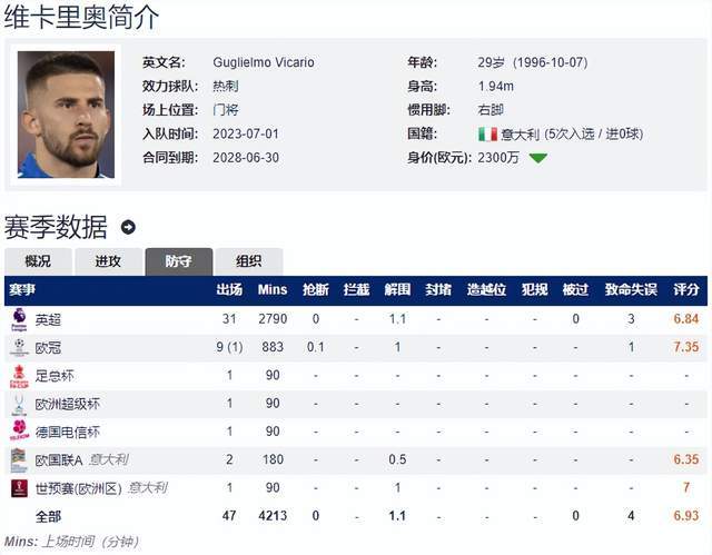 Guermo Vicario อายุ 29 ปี ผู้รักษาประตูชาวอิตาลี เกิดเมื่อวันที่ 7 ตุลาคม 1996 สูง 1.94 เมตร และใช้เท้าขวาของเขา ตอนนี้เล่นให้กับท็อตแนม เข้าร่วมในเดือนกรกฎาคม 2023 สัญญานี้อยู่ในเดือนมิถุนายน 2028 และปัจจุบันมีมูลค่า 23 ล้านยูโรและได้รับเลือกให้ทีมชาติอิตาลีห้าครั้ง ในฤดูกาลนี้ เขาลงเล่น 47 เกมในทุกรายการ และเขาลงเล่นทั้งหมด 4,213 นาที เขาเฉลี่ย 1.1 ครั้งต่อเกมด้วยคะแนนรวม 6.93 ต่อเกม