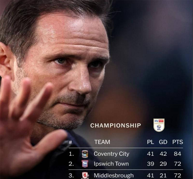 สถานการณ์การเงินของ Xie ในฤดูกาลนี้กำลังกังวลในวันพุธ และคะแนนอยู่ในลบในขณะนี้เพียง -5 คะแนนเนื่องจากการละเมิดทางการเงิน แผนการเข้าซื้อกิจการของทีมคาดว่าจะแล้วเสร็จในเร็วๆ นี้ ดังนั้นโคเวนทรีจึงไม่ใช่เรื่องยากที่จะเผชิญหน้ากับคู่ต่อสู้รายนี้ และเป็นเพียงเรื่องของเวลาก่อนที่จะมีการกำกับดูแลที่ราบรื่น ในเวลาเดียวกัน อิปสวิชซึ่งมีสองเกมน้อยกว่า ก็ยังตามหลังโคเวนทรี 12 แต้ม ดังนั้นโคเวนเจอร์จึงมีแนวโน้มที่จะอัพเกรดเป็นคนแรกในการแข่งขันชิงแชมป์ ทำให้แลมพาร์ดสามารถคว้าแชมป์ครั้งแรกในอาชีพโค้ชของเขาได้