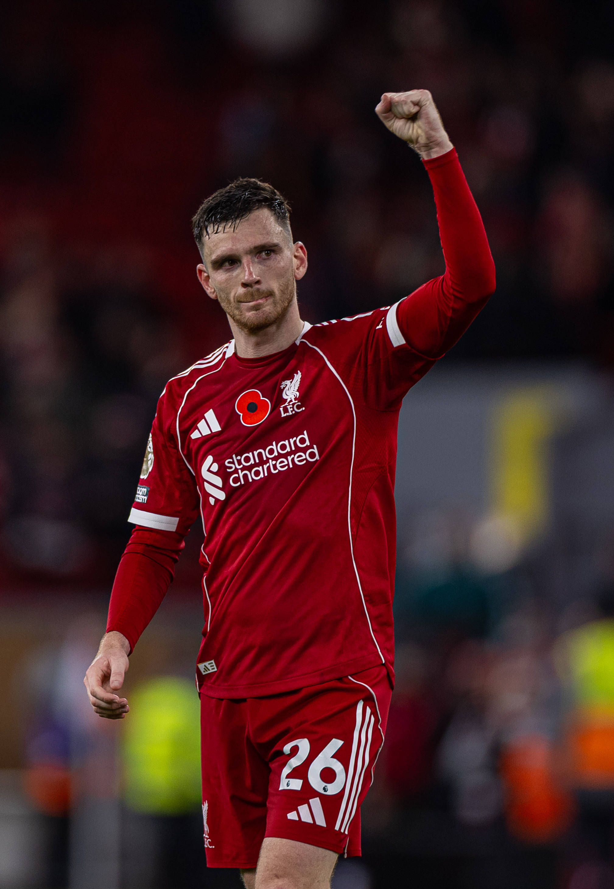 เมื่อวันที่ 1 พฤศจิกายน 2568 ในรอบที่สิบของฟุตบอลซูเปอร์ลีกอังกฤษในฤดูกาล 2025-2026 ลิเวอร์พูลเอาชนะแอสตัน วิลล่า 2-0 ที่บ้าน ภาพแสดงให้เห็น นักเตะ ลิเวอร์พูล โรเบิร์ตสัน ฉลองชัยชนะหลังเกม สำนักข่าวซินหัว