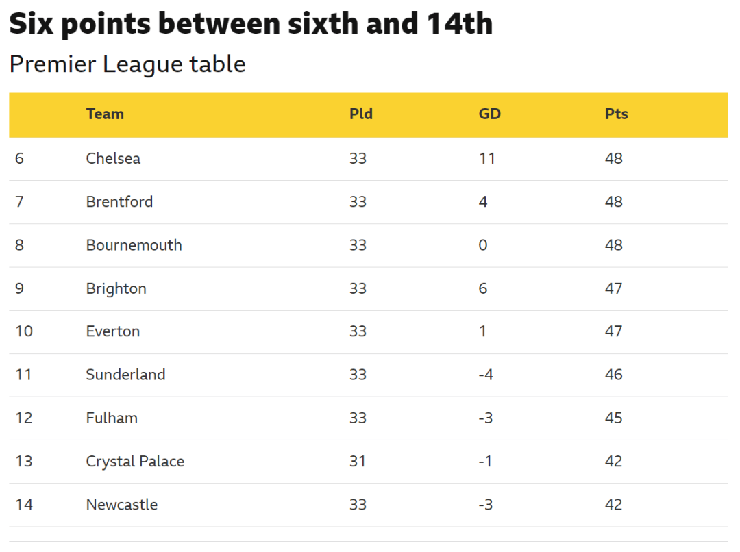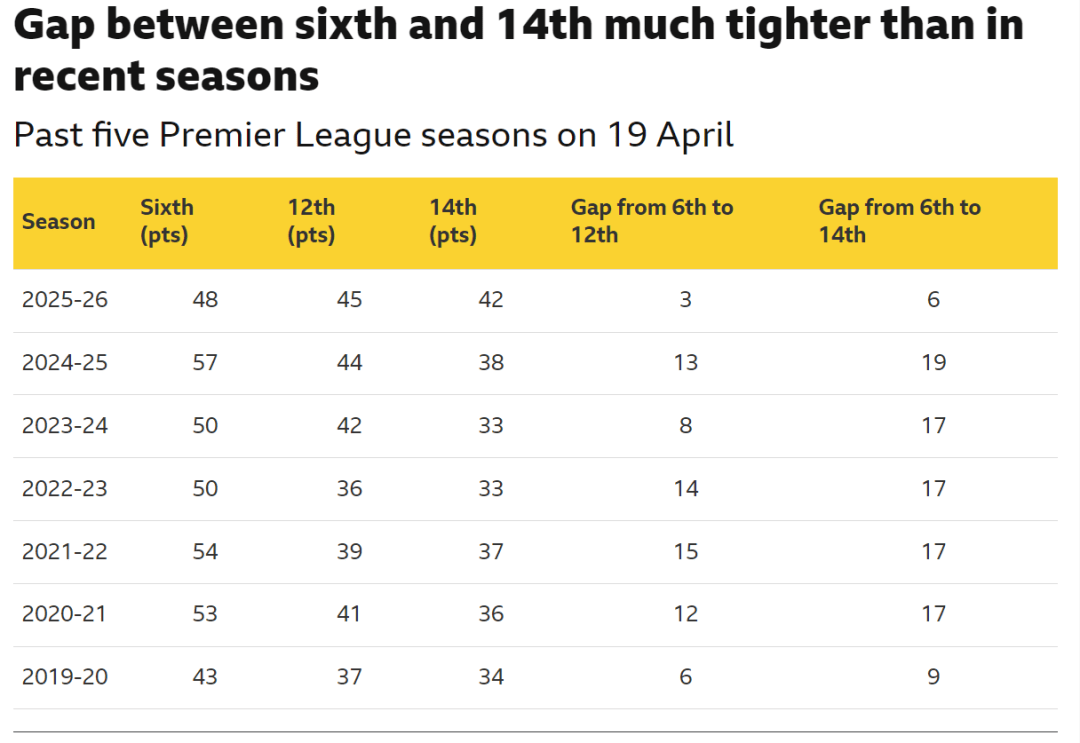 ในช่วงเวลาเดียวกันของปีที่แล้ว อันดับที่หกและอันดับที่ 14 ในพรีเมียร์ลีกมีคะแนนต่างกันถึง 19 แต้ม และสามฤดูกาลก่อนหน้านี้มี 17 แต้ม คะแนนเฉลี่ยความแตกต่างระหว่างทีมอันดับที่ 6 เมื่อวันที่ 19 เมษายน และทีมอันดับที่ 12 คือ 13 ใน 34 ฤดูกาลหลังจากก่อตั้งพรีเมียร์ลีก 3 คะแนน ความแตกต่างของคะแนนเฉลี่ยระหว่างทีมอันดับ 6 และทีมอันดับที่ 14 คือ 16.5 คะแนน
