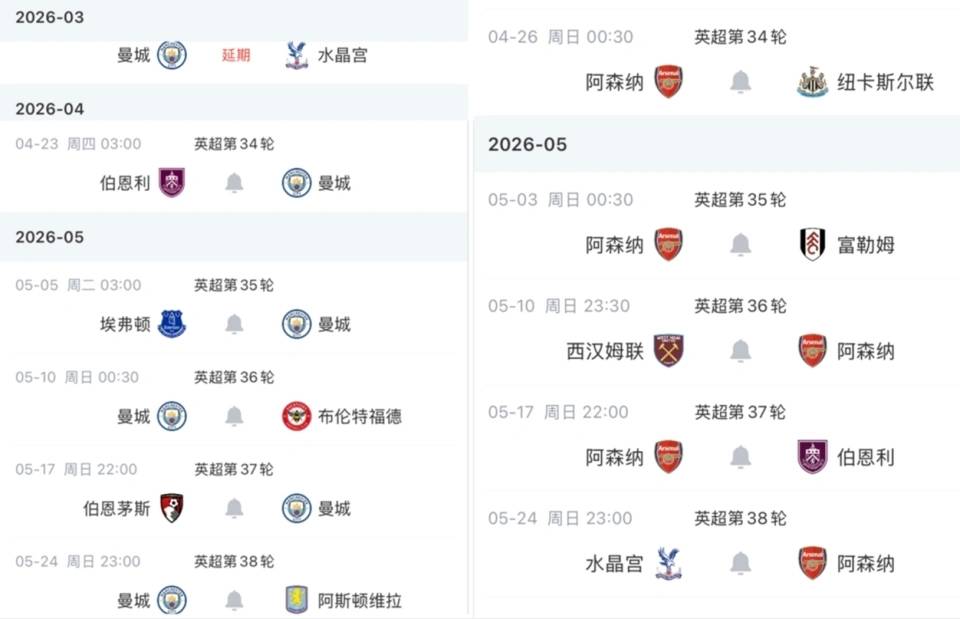 - 阿森纳本赛季英超剩余赛程(5场):主战纽卡斯尔、主战富勒姆、客战西汉姆联、主战伯恩利、客战水晶宫。