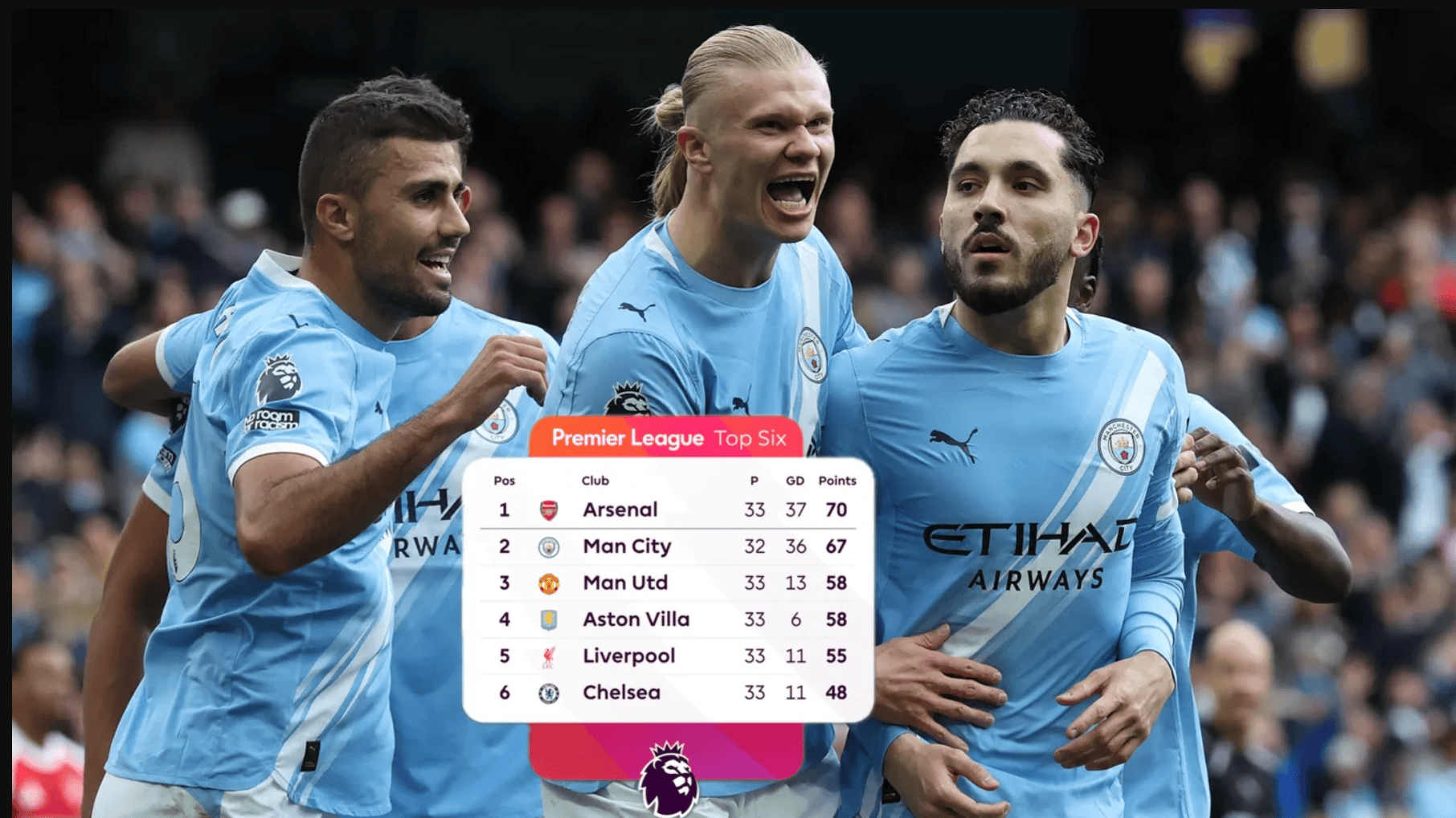 อันดับพรีเมียร์ลีกปัจจุบันคือ กันเนอร์ส อาร์เซนอล ชนะ 21 เสมอ 7 เสมอ 5 แพ้ 33 นัด อันดับ 1 ด้วยคะแนน 70 ประตู 63 ประตู และเสียไป 26 ประตู และผลต่างประตูคือ 37 อาร์เซนอลกำลังเล่นในแชมเปี้ยนส์ลีกและพรีเมียร์ลีกในการต่อสู้แบบสองบรรทัด เข้าถึงรอบรองชนะเลิศในแชมเปี้ยนส์ลีก และจะเล่นกับแอตเลติโกในรอบรองชนะเลิศ แมนเชสเตอร์ ซิตี้ ยิงได้ 67 แต้ม ชนะ 20 เสมอ 7 แพ้ 5 นัด 32 นัด ตามหลัง กันเนอร์ส 3 แต้ม ตามหลังมือปืน 3 แต้ม ยิงได้ 65 ประตู และเสียไป 29 ประตู และผลต่างประตูคือ 36 แมนเชสเตอร์ ซิตี้ ยังเล่นสองบรรทัด