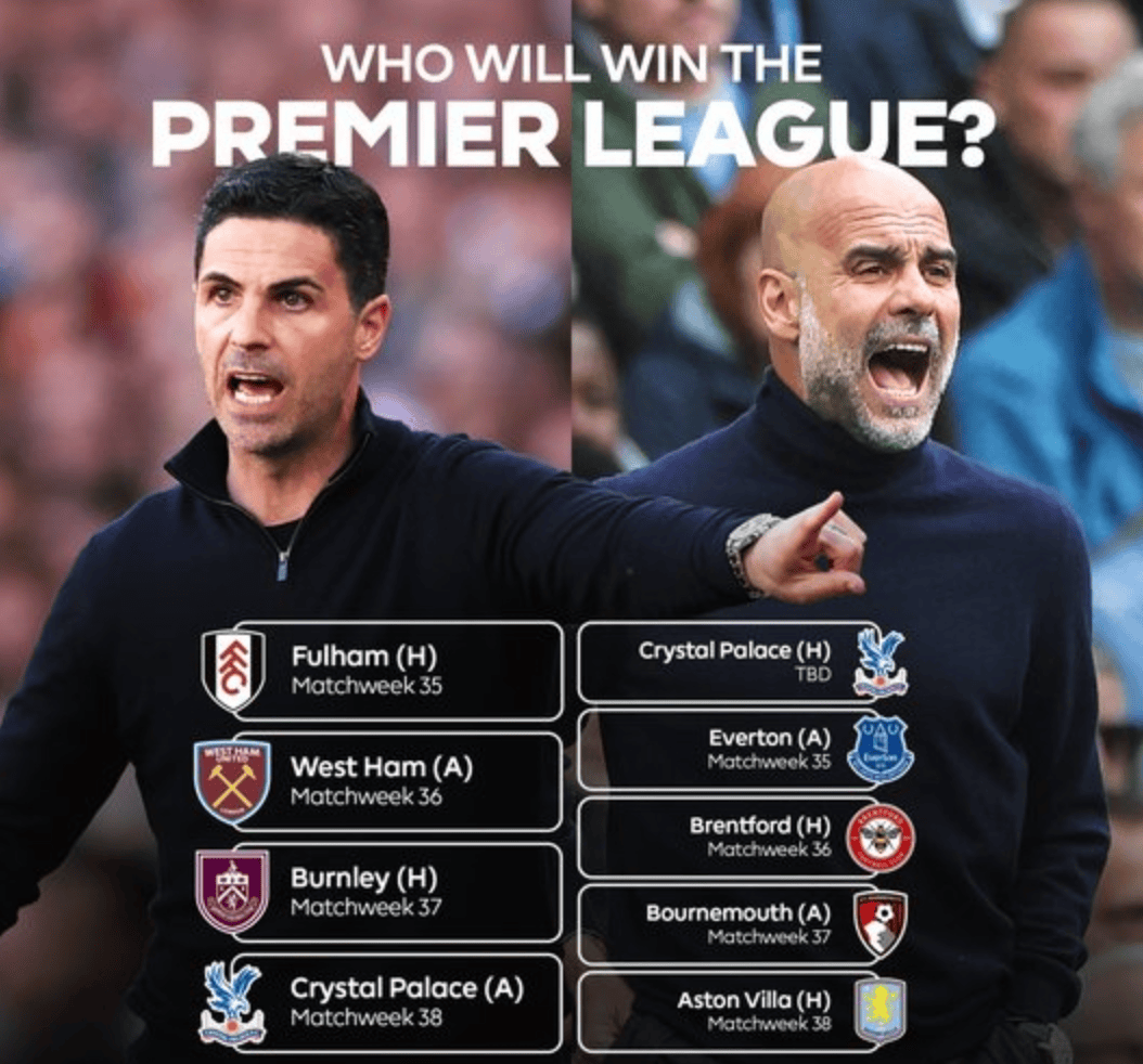 คู่ต่อสู้สี่คนต่อไปของอาร์เซนอลส่วนใหญ่เป็นอันดับพรีเมียร์ลีกที่ค่อนข้างต่ำ และคู่ต่อสู้ของแมนเชสเตอร์ซิตี้คือทีมกลางสตรีมซึ่งเป็นข่าวดีสำหรับอาร์เตต้า ท้ายที่สุดแล้ว ในบรรดาคู่แข่ง 5 คนของแมนเชสเตอร์ ซิตี้ รวมถึง บอร์นมัธ เบรนท์ฟอร์ด เอฟเวอร์ตัน ฯลฯ ยังมีทีมที่มีโอกาสแข่งขันโควต้าแชมเปียนส์ลีก ในบรรดาคู่ต่อสู้สี่คนของอาร์เซนอล เบิร์นลีย์ยืนยันว่าการตกชั้นถูกผลักไส คริสตัล พาเลซไม่มีความปรารถนา และฟูแล่มไม่มีแรงกดดันมากนัก มีเพียงเวสต์แฮมยูไนเต็ดเท่านั้นที่มีภารกิจในการตกชั้นซึ่งค่อนข้างง่ายกว่า