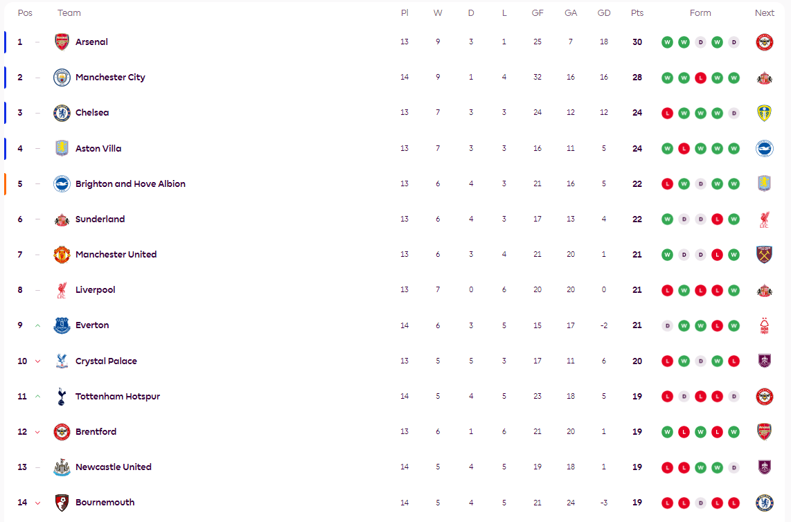 ในช่วงเช้าตรู่ของวันที่ 3 ธันวาคม ตามเวลาปักกิ่ง การแข่งขันสามคู่ในรอบที่ 14 ของพรีเมียร์ลีกได้จบลงแล้ว: บอร์นมัธ 0-1 เอฟเวอร์ตัน; ฟูแล่ม 4-5 แมนเชสเตอร์ ซิตี้; นิวคาสเซิล ยูไนเต็ด 2-2 ท็อตแน่ม ฮ็อตสเปอร์ส ตารางคะแนนล่าสุดเป็นดังนี้: