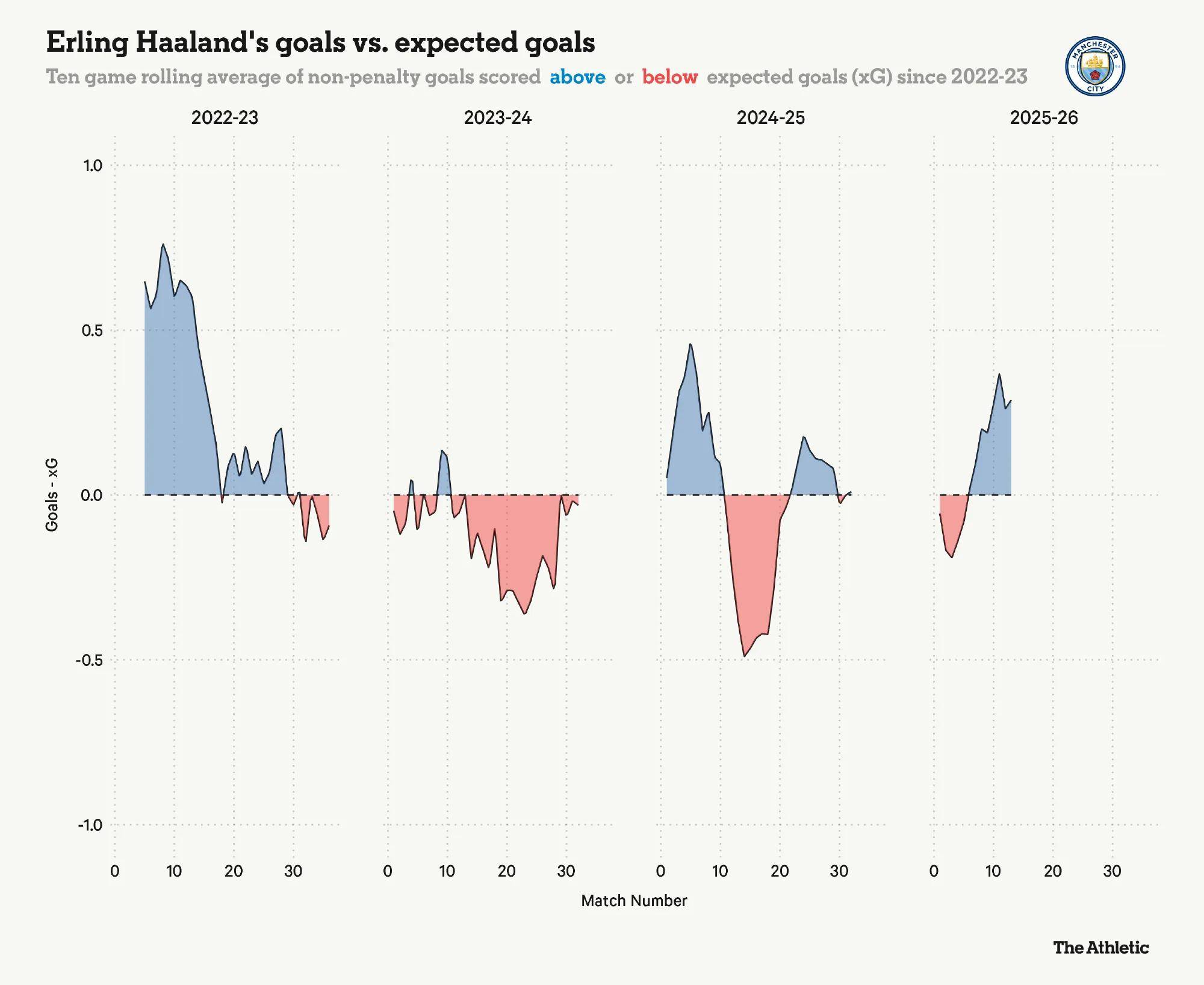 การเปรียบเทียบจำนวนประตูที่ทำได้จริงกับจำนวนประตูที่คาดหวังแสดงให้เห็นว่าในช่วงสี่ฤดูกาลแรกที่แมนเชสเตอร์ ซิตี้ ฮาแลนด์มีประสิทธิภาพการทำประตูสูงสุดในฤดูกาลแรกของเขา ฤดูกาลที่สองของเขาเห็นฟอร์มตกลงเล็กน้อย แม้ว่าฤดูกาลนี้จะเห็นการกลับมาของความสามารถในการทำประตูที่น่าเกรงขามของเขาอีกครั้ง