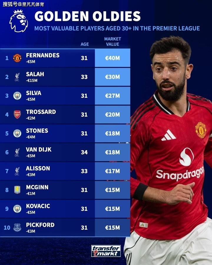 Transfermarkt ได้จัดทำอันดับผู้เล่นพรีเมียร์ลีกที่มีอายุ 30 ปีขึ้นไปตามมูลค่าตลาด โดยกัปตันทีมแมนเชสเตอร์ ยูไนเต็ด บรูโน่ แฟร์นันด์ส ครองอันดับหนึ่ง