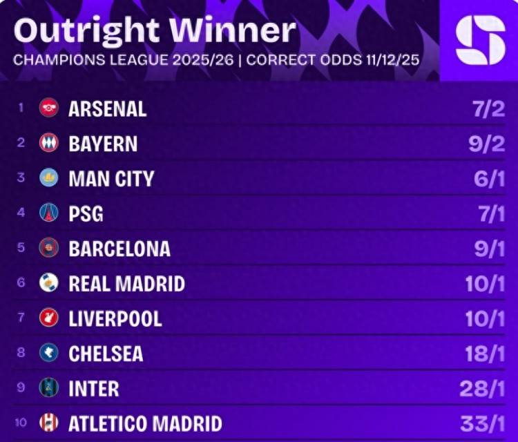 欧冠夺冠赔率前十榜单: