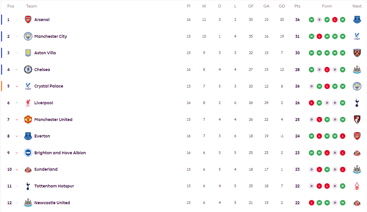 ตารางคะแนนพรีเมียร์ลีก: อาร์เซนอลนำเป็นจ่าฝูงด้วยคะแนนนำห้าแต้ม, เชลซีไต่ขึ้นมาสี่อันดับ, ลิเวอร์พูลขยับขึ้นหกอันดับ, รอผลการแข่งขันของแมนเชสเตอร์ ยูไนเต็ด_แมนเชสเตอร์ ซิตี้_คริสตัล พาเลซ_อาร์เซนอล