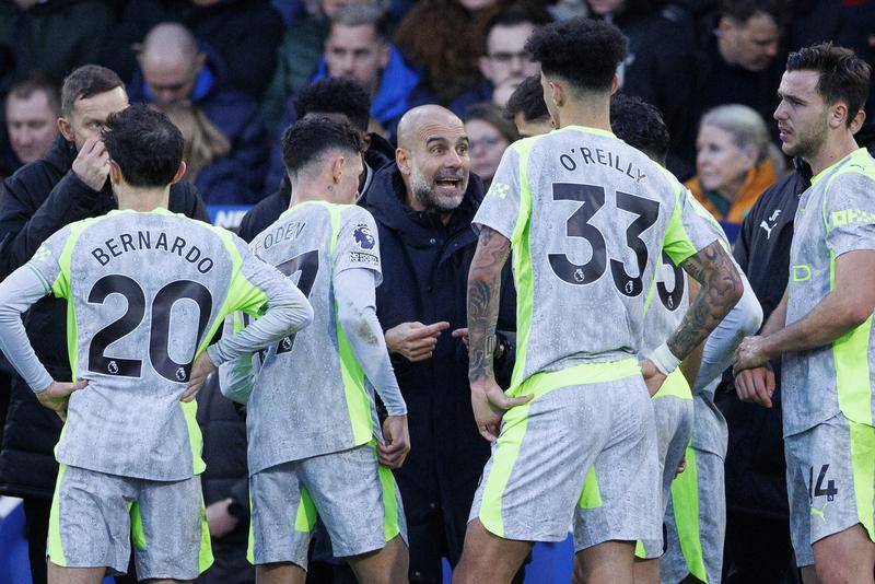 เมื่อวันที่ 14 ธันวาคม ผู้จัดการทีมแมนเชสเตอร์ ซิตี้ เป๊ป กวาร์ดิโอลา (กลาง) สนทนากับนักเตะของเขา