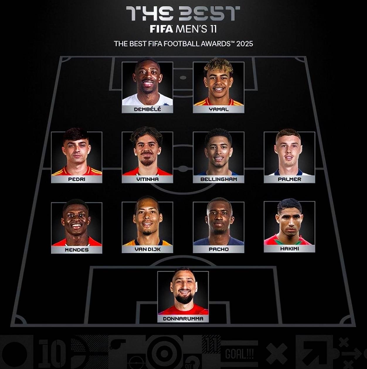 นอกจากนี้ ทีมยอดเยี่ยมแห่งปีของฟีฟ่า 2025 ได้ถูกเปิดเผยแล้วดอนนารุมม่า (ปารีส/แมนเชสเตอร์ ซิตี้), อาชราฟ (ปารีส), ปาโก (ปารีส), ฟาน ไดจ์ค (ลิเวอร์พูล), เมนเดส (ปารีส), พาลเมอร์ (เชลซี), เบลลิงแฮม (เรอัล มาดริด), วิตินญ่า (ปารีส), เปดรี (บาร์เซโลนา), ยาร์โมเลนโก้ (บาร์เซโลนา), เดมเบเล่ (ปารีส) ได้รับการคัดเลือก