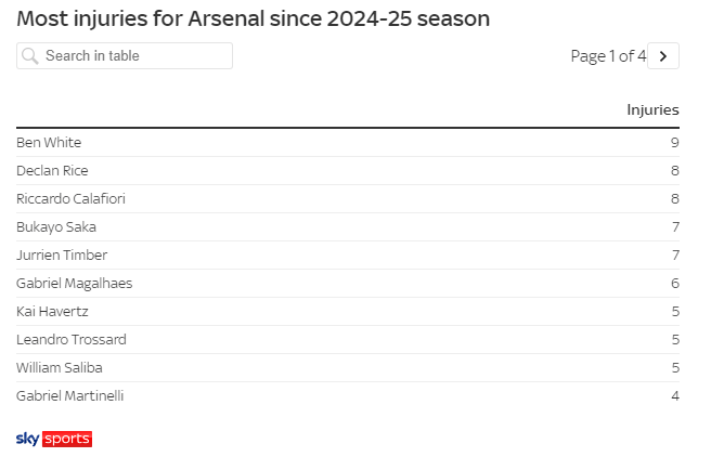 เมื่อวันที่ 19 ธันวาคม เวลาปักกิ่ง สกาย สปอร์ตส์ รายงานว่า นับตั้งแต่เริ่มต้นฤดูกาล 2024-25 อาร์เซนอลประสบปัญหาอาการบาดเจ็บถึง 100 ครั้งเต็ม ถือเป็นอันดับหนึ่งในตารางพรีเมียร์ลีกในแง่นี้
