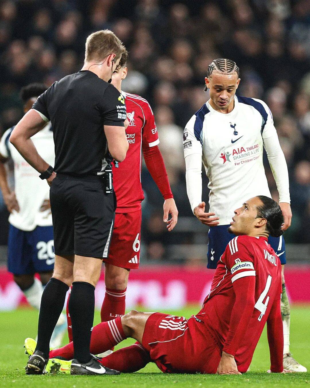 จุดสนใจของเหตุการณ์นี้อย่างไม่ต้องสงสัยคือการแจกใบแดงให้กับฮาร์วีย์ ซิมอนส์ ในนาทีที่ 29 เวอร์จิล ฟาน ไดจ์ค กองหลังตัวหลักของลิเวอร์พูลได้ครองบอลและเดินหน้าไปข้างหน้า ทำให้ฮาร์วีย์ ซิมอนส์กดดันอย่างรุนแรง อย่างไรก็ตาม ในระหว่างการปะทะนี้ ซิมอนส์ได้เตะโดยตรงไปที่บริเวณเอ็นร้อยหวายของน่องฟาน ไดจ์คจากด้านหลัง ทำให้ฟาน ไดจ์คทรุดลงด้วยความเจ็บปวดหลังจากการปรึกษากับผู้ช่วยผู้ตัดสินวิดีโอ (VAR) ผู้ตัดสินได้แสดงใบแดงโดยตรงต่อซิมอนส์อย่างเด็ดขาด ส่งผลให้เขาถูกไล่ออกจากสนามทันที การตัดสินใจนี้หมายความว่าซิมอนส์จะต้องถูกแบนสามนัด ซึ่งถือเป็นความเสียหายครั้งใหญ่สำหรับท็อตแน่ม ฮ็อตสเปอร์