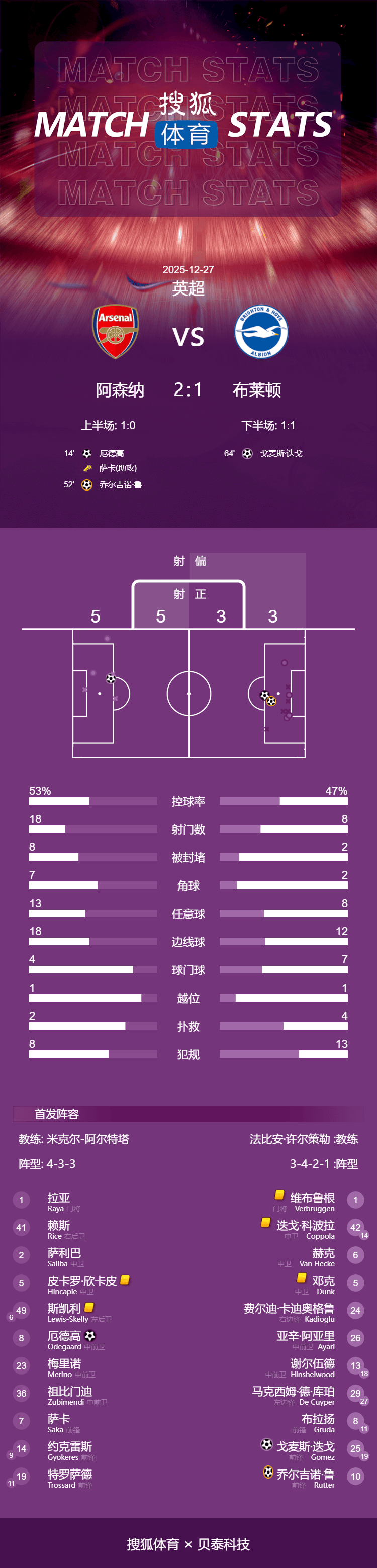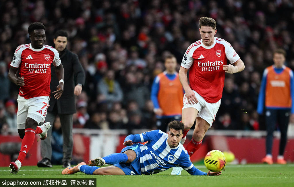 เวลา 23:00 น. ตามเวลาปักกิ่ง วันที่ 27 ธันวาคม อาร์เซนอลเปิดบ้านรับการมาเยือนของไบรท์ตัน ในรอบที่ 18 ของพรีเมียร์ลีกในครึ่งแรก บูกาโย ซากา ทำแอสซิสต์ให้ มาร์ติน โอเดการ์ด ยิงประตูเปิดเกม ทำให้ อาร์เซนอล นำ 1-0 ในช่วงพักครึ่ง หลังจากพักครึ่ง เดคลาน ไรซ์ ทำให้ เลอันโดร ทรอสซาร์ ทำเข้าประตูตัวเอง ทำให้ อาร์เซนอล นำห่าง 2-0 ไบรท์ตัน ตีไข่แตกได้จาก ดิเอโก้ โกเมซ แต่สุดท้าย อาร์เซนอล เอาชนะไปได้ 2-1 ทำให้พวกเขายังคงรักษาความได้เปรียบสองคะแนนบนตารางพรีเมียร์ลีก