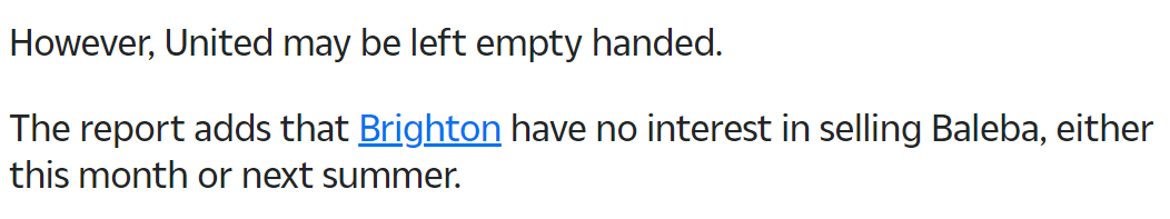 บาลีบ้าเองมีความกระตือรือร้นอย่างมากที่จะเข้าร่วมกับแมนเชสเตอร์ ยูไนเต็ด เนื่องจากโอลด์ แทรฟฟอร์ดเป็นเวทีที่ใหญ่กว่าไบรท์ตันโดยธรรมชาติและสามารถให้รายได้ที่สูงกว่า อย่างไรก็ตาม ไบรท์ตันเชื่อว่าหากนักเตะไม่สามารถทำผลงานได้ดีเนื่องจากข่าวลือเรื่องการย้ายทีม มันจะไม่เป็นประโยชน์ต่อทั้งสองฝ่ายจากการที่แมนเชสเตอร์ ยูไนเต็ด ได้ตั้งใจรบกวนสมาธิของนักเตะไบรท์ตันในช่วงตลาดซื้อขายสองครั้งติดต่อกัน ทางทีมนกนางนวลมีความตั้งใจที่จะยืนหยัดอย่างหนักแน่น หากมีข้อเสนอใดที่ต่ำกว่ามูลค่าที่พวกเขาประเมินไว้ พวกเขาจะไม่ขายบาเลบา – ข้อนี้ใช้ได้ทั้งในช่วงตลาดซื้อขายเดือนมกราคมและช่วงตลาดซื้อขายฤดูร้อนที่กำลังจะมาถึง!