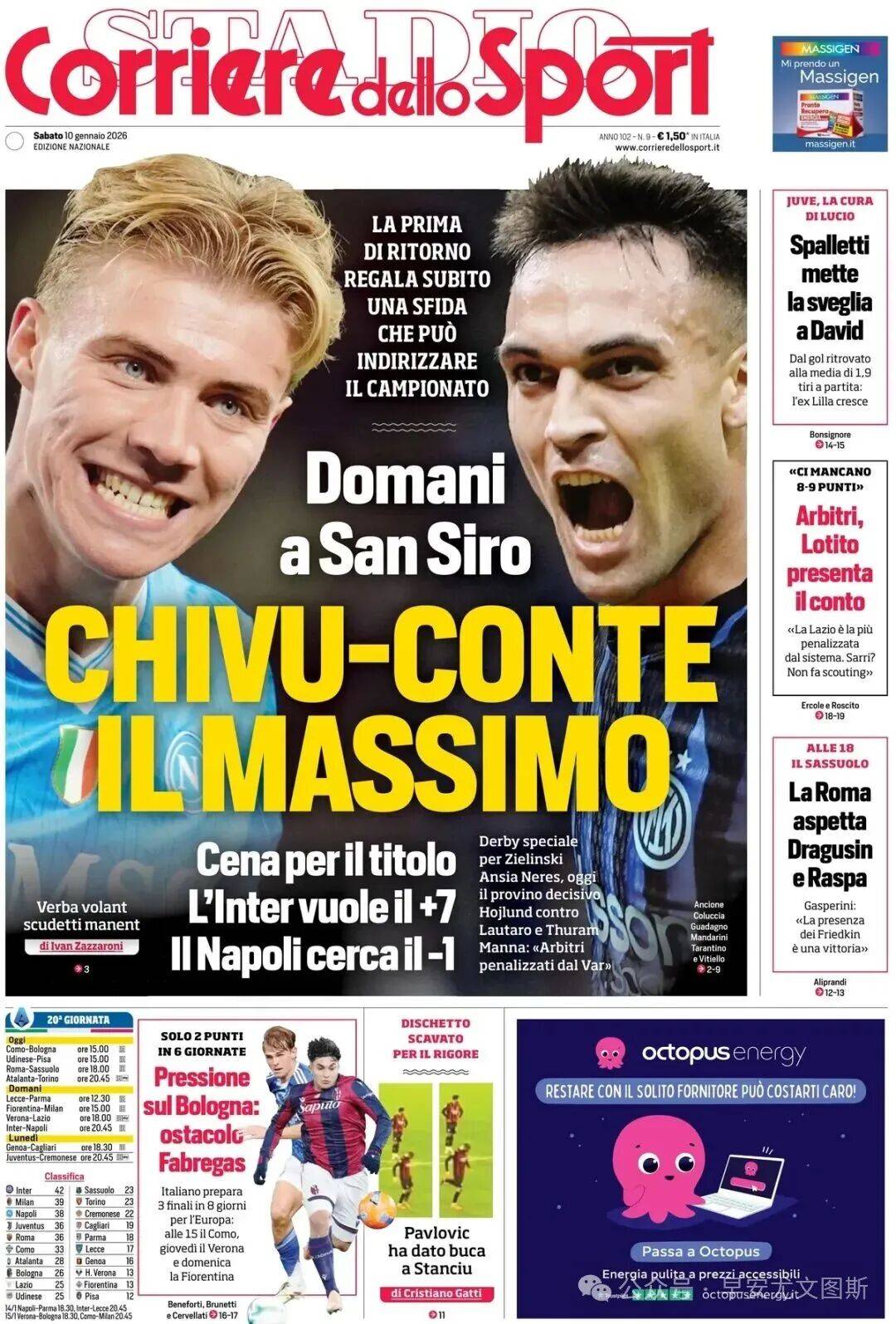 1. อินเตอร์ พบ นาโปลี: การปะทะของยักษ์ใหญ่พรุ่งนี้ที่ซานซิโร การดวลครั้งแรกนี้อาจตัดสินปัญหาสำคัญของทั้งสองฝ่ายในฤดูกาลนี้ การเผชิญหน้าชิงแชมป์: อินเตอร์ต้องการขยายคะแนนนำเป็นเจ็ดแต้ม ขณะที่นาโปลีตั้งเป้าลดช่องว่างเหลือเพียงหนึ่งแต้ม ดาร์บี้แมตช์พิเศษของซีลินสกี้ ความกังวลของเนเรส การทดสอบชี้ขาดในวันนี้ โฮลแลนด์ปะทะตูรานและเลาตาโร มานนา: "ผู้ตัดสินได้รับอิทธิพลจาก VAR"
