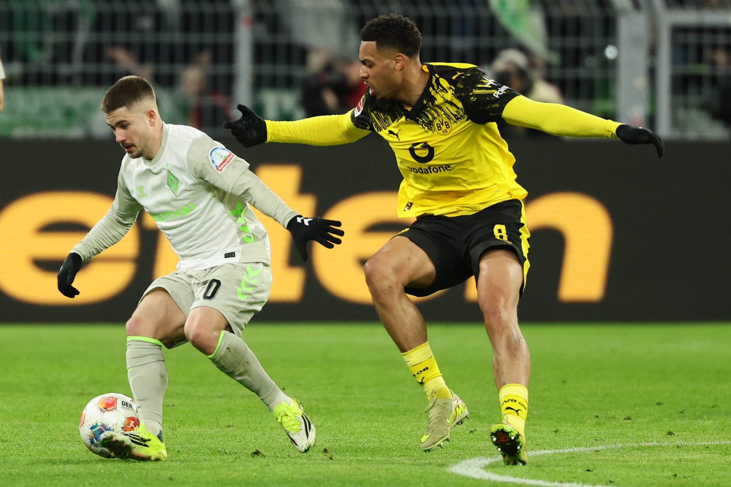 เมื่อวันที่ 13 มกราคม ซิลวาของโบรุสเซีย ดอร์ทมุนด์ (ซ้าย) และฟรีเดลของแวร์เดอร์ เบรเมน แย่งชิงการครองบอลระหว่างการแข่งขัน สำนักข่าวซินหัว (ภาพโดย Joachim Bivallés)