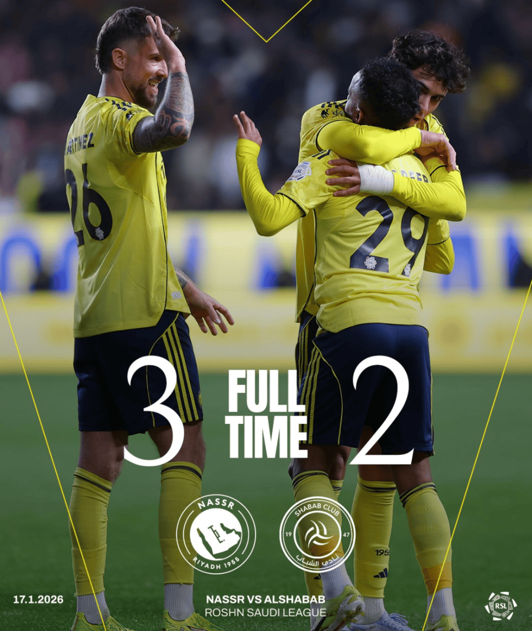 อัล นาสร์ หยุดสถิติแพ้สามนัดติดต่อกันและไร้ชัยสี่นัดด้วยการชนะในบ้านอย่างหวุดหวิด 3-2 เหนืออัล ฮิลาล ในเกมลีกนัดล่าสุด ผู้รักษาประตูชาวโปรตุเกส รูเบน ปาตริซิโอ กลับมาเป็นตัวจริงแทน นาวาฟ อัล อักกีดี ที่ถูกแบน มาร์เซโล่ โบรโซวิช ที่ทำผลงานไม่ดีในดาร์บี้แมตช์ที่ริยาด ถูกแทนที่โดย เวสลีย์ ขณะที่ ยาห์ยา แบ็กขวา ก็ถูกดรอปออกจากสิบเอ็ดตัวจริงเช่นกันอัล นาสร์ เริ่มครึ่งแรกได้อย่างสดใส โดยจังหวะที่ João Félix จ่ายบอลให้โรนัลโด้ ก่อนที่กองหลังอัล ฮิลาลจะสกัดเข้าประตูตัวเอง ขณะที่โคนามทำประตูสุดสวยด้วยการตีลังกายิง อย่างไรก็ตาม ขณะที่แฟนบอลคาดหวังถึงชัยชนะที่ง่ายดาย ซิมากันที่ไว้ใจได้เสมอ ก็ทำพลาดอีกครั้งด้วยการยิงเข้าประตูตัวเองให้กับฝ่ายตรงข้ามในครึ่งหลัง ยานนิค กาสโตร ผ่านบอลอย่างสวยงามให้จูเนียร์ทำประตูแบบตัวต่อตัว คิงสลีย์ โกมาน วิ่งทะลุแนวรับอย่างเฉียบคมทำให้คู่แข่งโดนใบแดง และด้วยจำนวนผู้เล่นที่มากกว่า อัล นาสเซอร์ ทำประตูชัยผ่านอับดุลราห์มาน กาเร็บ