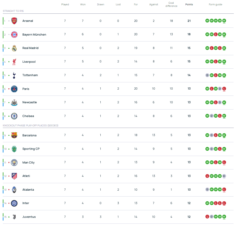 อันดับแชมเปียนส์ลีก: อาร์เซนอลและบาเยิร์นผ่านเข้ารอบ ขณะที่ 13 ทีมคว้าตั๋วเข้ารอบ; 8 ยักษ์ใหญ่ที่มี 13 คะแนนเตรียมดวลรอบสุดท้าย เพลย์ออฟ: ยูเวนตุส, อินเตอร์ มิลาน