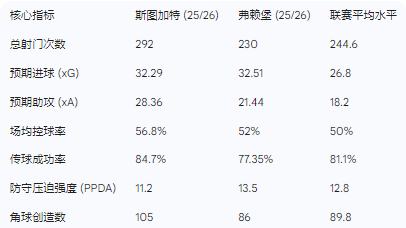 หลังจาก 19 รอบของฤดูกาล 2025/26 ตัวชี้วัดหลักของทั้งสองทีมเผยให้เห็นถึงประสิทธิภาพทางยุทธวิธีอย่างลึกซึ้งจำนวนประตูรวมที่สตุ๊ตการ์ตทำได้อยู่ที่ 36 ประตู ขณะที่ค่าคาดการณ์ประตู (xG) ของพวกเขาอยู่ที่ 32.29 ประตู ซึ่งบ่งชี้ว่าทีมมีความสามารถในการจบสกอร์ที่ยอดเยี่ยมในเขตโทษ โดยเฉพาะอย่างยิ่งผ่านความเยือกเย็นของเดนิส อันดาวในตำแหน่งสำคัญ ๆ ขณะที่ค่า xG ของไฟร์บวร์กอยู่ที่ 32.51 ประตู ซึ่งใกล้เคียงกับจำนวนประตูจริงที่ทำได้ 31 ประตูอย่างมาก สะท้อนให้เห็นถึงอัตราการเปลี่ยนโอกาสเป็นประตูที่คงเส้นคงวาอย่างน่าประทับใจของทีม