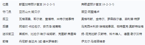 สำหรับสตุ๊ตการ์ท เอล ฮานูส ที่ลงสนามเป็นตัวสำรองในศึกยูโรปาลีกกลางสัปดาห์ที่ผ่านมา กำลังอยู่ในฟอร์มที่ดีและดูเหมือนจะกลับมาเป็นตัวจริงอีกครั้ง โดยจะคอยจ่ายบอลทะลุช่องอย่างแม่นยำให้กับออนดาวสำหรับไฟร์บวร์ก ด้วยการที่คูบเลอร์ไม่สามารถลงเล่นได้ บรุโน่ โอกบุส ดาวรุ่งอาจได้ลงเล่นในตำแหน่งปีกขวา อย่างไรก็ตาม เขาจะต้องเผชิญหน้ากับความท้าทายโดยตรงจากฟริชและมิตเทลชตัดท์ ซึ่งอาจเป็นจุดเปลี่ยนสำคัญในเกมนี้