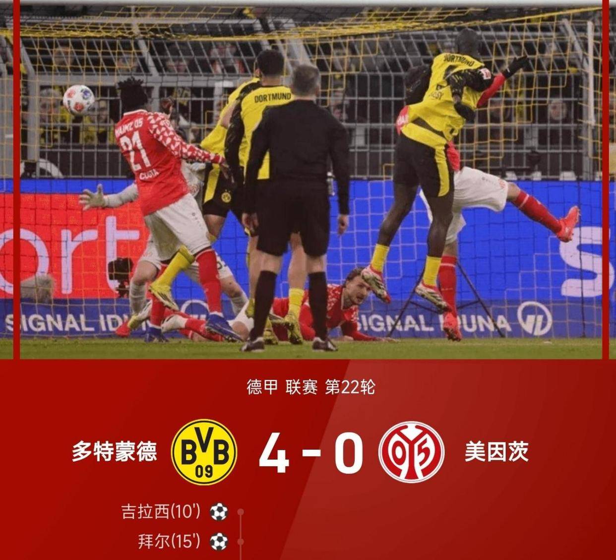 เมื่อเปรียบเทียบกับความพ่ายแพ้อย่างไม่คาดคิดของปารีสและการหนีรอดอย่างหวุดหวิดของมิลาน โบรุสเซีย ดอร์ทมุนด์ได้มอบชัยชนะอย่างเหนือชั้นบนสนามเหย้าของพวกเขาเอง ในการพบกับไมนซ์ที่กำลังต่อสู้เพื่อความอยู่รอด ดอร์ทมุนด์ได้ครองเกมตั้งแต่เริ่มแรกในนาทีที่ 10 ดอร์ทมุนด์ได้ฟรีคิกทางฝั่งขวา รีสส่งบอลเข้าไปในกรอบเขตโทษ ซึ่งกองหน้าจิโรด์-ชามาเดโหม่งบอลเข้าประตูที่เสาแรก บอลพุ่งเข้าเสาไกล ทำให้ดอร์ทมุนด์ออกสตาร์ทได้อย่างยอดเยี่ยมด้วยสกอร์ 1-0