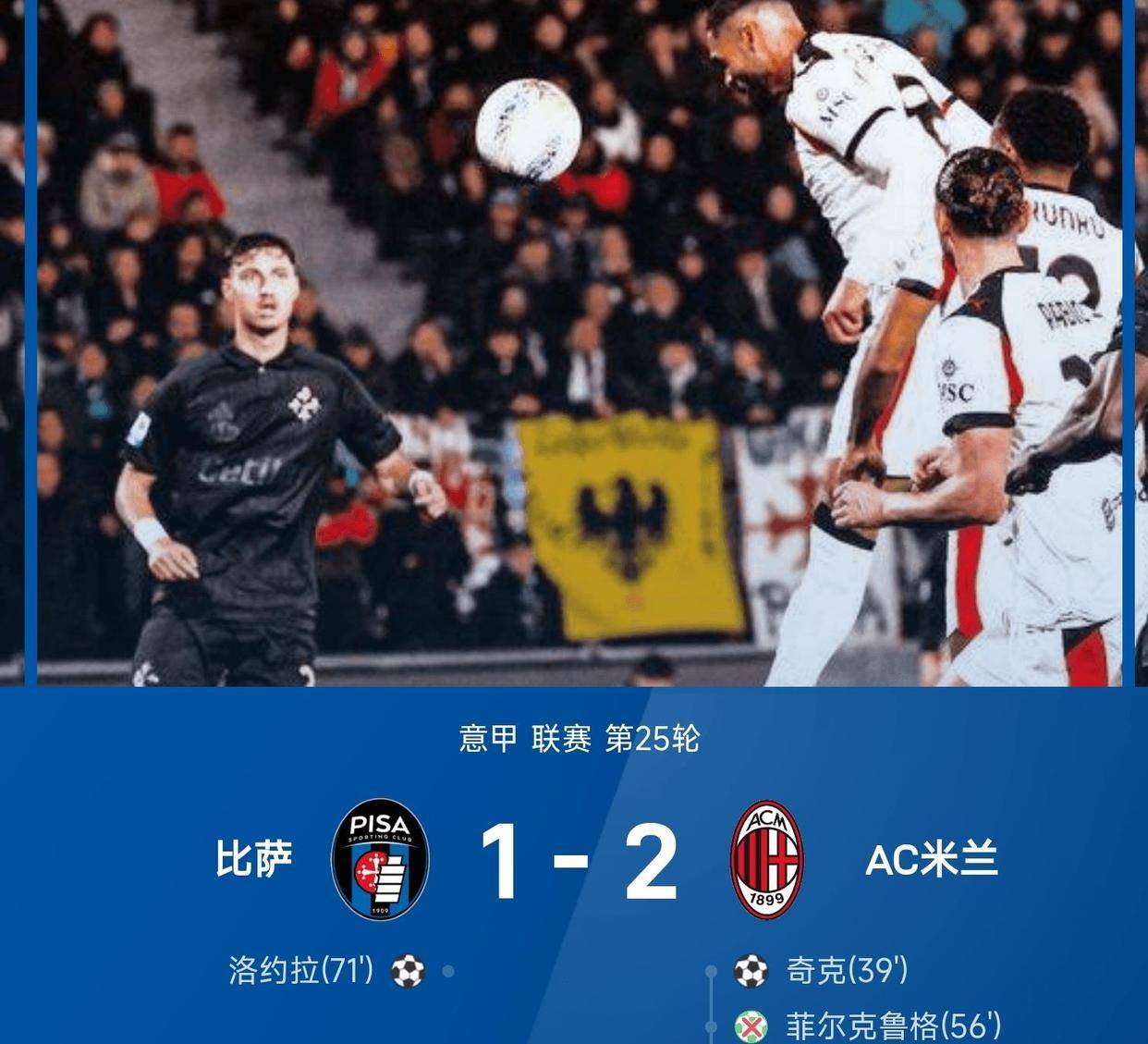 ในขณะเดียวกัน ที่ประเทศอิตาลี การแข่งขันเยือนของเอซี มิลาน ก็เต็มไปด้วยความยุ่งยากไม่แพ้กัน เมื่อต้องพบกับปisa ทีมที่เพิ่งเลื่อนชั้นขึ้นมาใหม่ ทีมรอสโซเนรีไม่สามารถครองเกมได้อย่างเด็ดขาดในสนาม ปisa ที่มีระบบป้องกันที่แข็งแกร่งและมีการจัดระเบียบอย่างดี ทำให้การโจมตีของมิลานถูกสกัดกั้นอย่างต่อเนื่อง สกอร์ยังคงเสมอกันอยู่ 0-0 จนกระทั่งช่วงท้ายของครึ่งแรกในนาทีที่ 40 มิลานเริ่มโจมตีทางฝั่งขวา อาตาคาเมส่งบอลข้ามเข้าไปในกรอบเขตโทษ ซึ่งชิค กองกลางชาวอังกฤษ โหม่งบอลเข้าไปให้มิลานขึ้นนำ 1-0