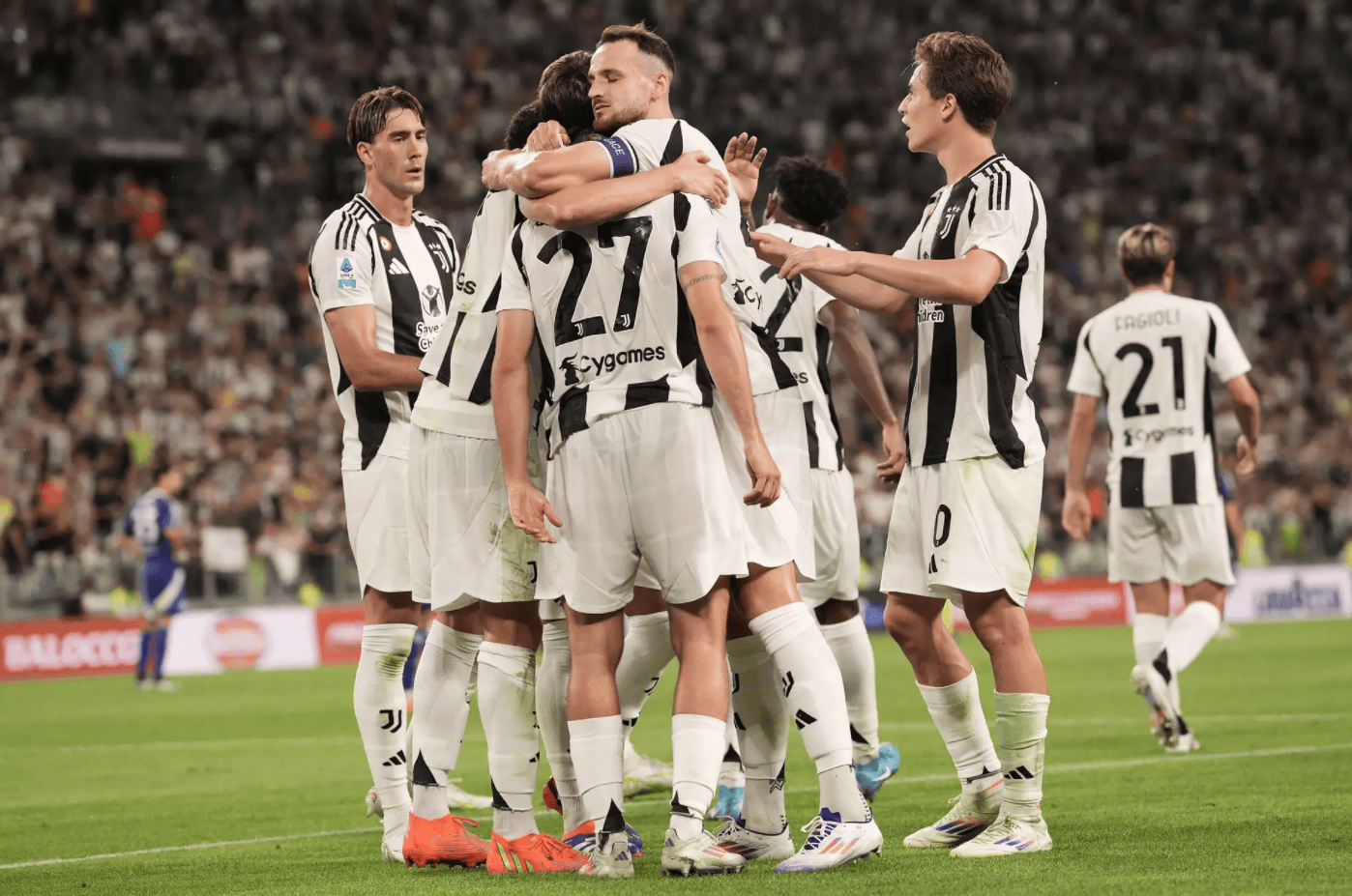 ในนาทีที่ 10 โคโมเปิดสกอร์ขึ้นนำ! ดูวิคัสจ่ายบอลเฉียงจากกลางสนามไปให้ โวจโวดิช ทางริมเส้นฝั่งขวา หลังจากเลี้ยงบอลหลบกองหลังในกรอบเขตโทษ โวจโวดิชยิงบอลที่ดิ เกรกอริโอ ปัดออกมาได้แต่บอลไหลข้ามเส้นเข้าประตูไป ยูเวนตุส 0-1 โคโมในนาทีที่ 60 โคโมหนีห่างเป็นสองประตู! จากจังหวะสวนกลับ วอยโวดานจ่ายบอลทะลุช่องเข้าเขตโทษจากฝั่งขวา ดาคูเนียตัดบอลย้อนเข้ากลางให้คาเซเรโร่ยิงโล่งเข้าไปตุงตาข่าย ยูเวนตุส 0-2 โคโม เบียงโคเนรี่ยังคงไร้ชัยในสามนัดลีกติดต่อกัน ขณะนี้ตามหลังกลุ่มท็อปโฟร์อยู่หนึ่งแต้ม