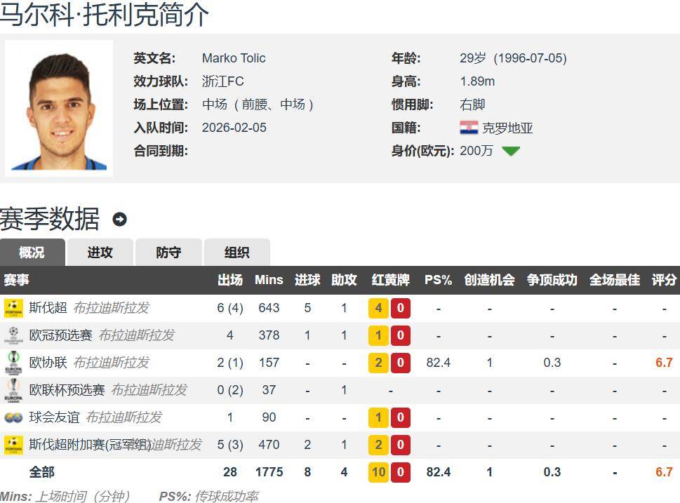 การเซ็นสัญญาดาวเด่นของไชนีส ซูเปอร์ลีก: นักเตะหมายเลข 10 คนใหม่ของเจ้อเจียง ผู้ทำประตูในแชมเปี้ยนส์ลีกฤดูกาลที่แล้วกับบาเยิร์น มิวนิค - กองกลางตัวรับวัย 29 ปี โทลจิค