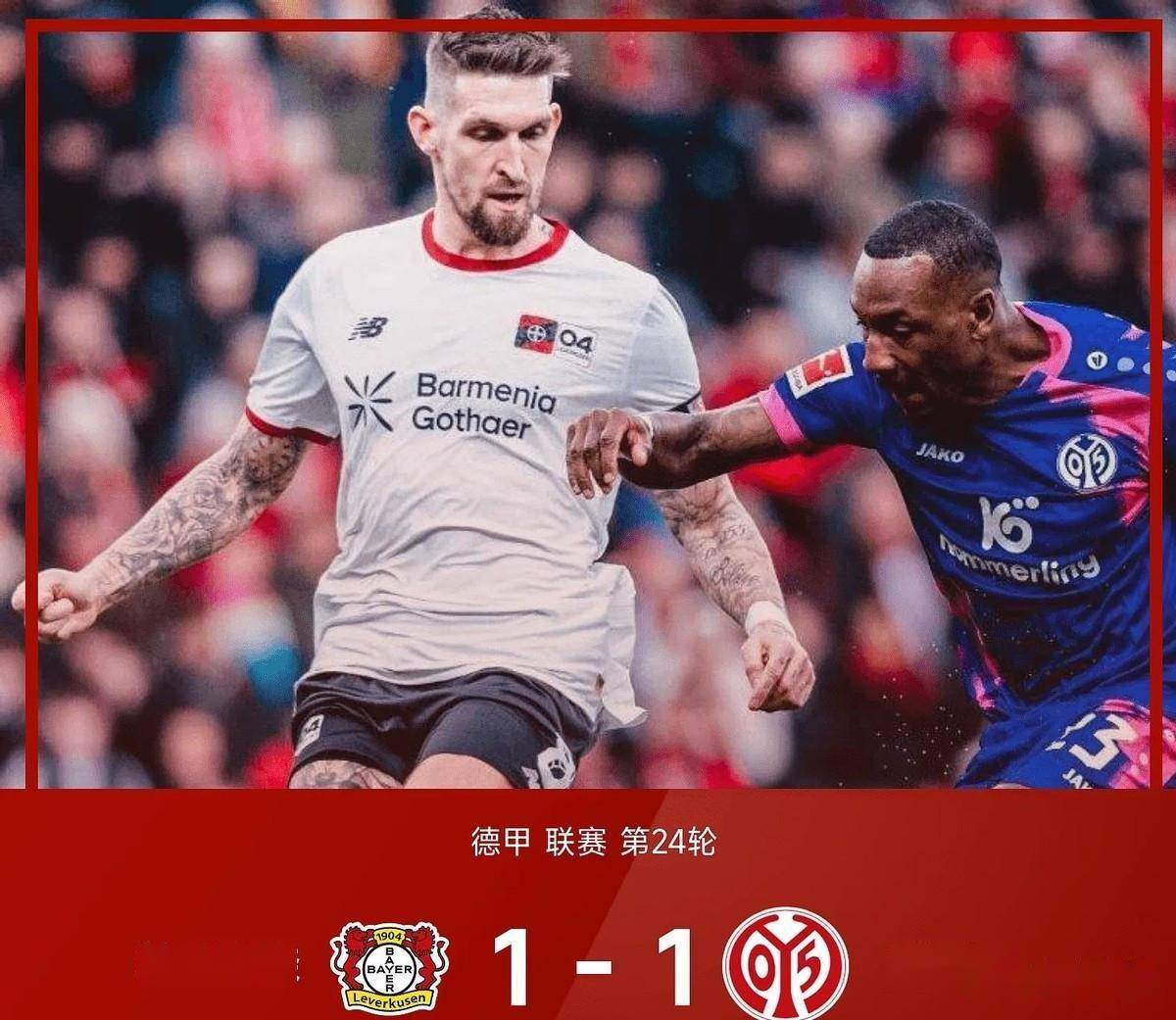 ในที่สุดทางตันก็ถูกทำลายในนาทีที่ 67 ของครึ่งหลัง ไมนซ์เปิดเกมโต้กลับอย่างรวดเร็ว โดยเนเบอร์พาบอลขึ้นหน้า ก่อนจะเปิดบอลต่ำเข้ามาในเขตโทษ เบคเกอร์ที่วิ่งมาถึงริมกรอบเขตโทษยิงวอลเลย์ทันที บอลพุ่งเสียบมุมบนเข้าไปอย่างสวยงาม ส่งให้ไมนซ์ขึ้นนำ 1-0 ในเกมเยือนเลเวอร์คูเซ่น เมื่อเป็นฝ่ายตามหลัง เลเวอร์คูเซ่นพยายามบุกเพื่อหวังตีเสมอ แต่ไม่สามารถหาช่องเจาะแนวรับของไมนซ์ได้ จนกระทั่งนาทีที่ 88 ที่ไบเออร์ เลเวอร์คูเซ่นสามารถคว้าโอกาสของพวกเขาได้สำเร็จ โคฟานา ผู้เล่นสำรอง ส่งบอลข้ามจากริมเส้นอย่างแม่นยำ และกองหลังตัวสำรองอีกคนคือคุนซา ก็อยู่ตรงนั้นเพื่อยิงเข้าประตูจากระยะใกล้ ทำให้สกอร์กลับมาเสมอกันที่ 1-1 ประตูตีเสมอในนาทีสุดท้ายนี้ทำให้เลเวอร์คูเซ่นได้แต้มสำคัญจากการแข่งขันที่สู้กันอย่างหนักในบ้าน แม้ว่าจะหมายความว่าพวกเขาไม่สามารถชนะในสองนัดล่าสุดในลีกก็ตาม