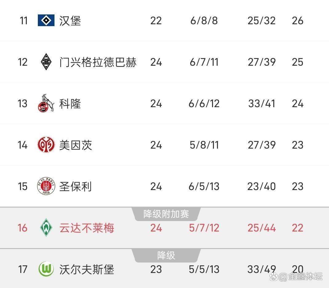 ในครึ่งล่างของตาราง ไมนซ์เสมอกับไบเออร์ เลเวอร์คูเซ่น ทำให้มี 23 คะแนนและอยู่ในอันดับที่สิบสี่ ส่วนเซนต์เพาลีก็มี 23 คะแนนเช่นกันหลังจากเอาชนะฮอฟเฟ่นไฮม์ ทำให้อยู่ในอันดับที่สิบห้าตามผลต่างประตูได้เสีย แวร์เดอร์ เบรเมน อยู่ในอันดับที่สิบหกด้วย 22 คะแนน ขณะที่โวล์ฟสบวร์กอยู่ในอันดับที่สิบเจ็ดด้วย 20 คะแนน ไฮเดนไฮม์ยังคงจมอยู่ก้นตารางด้วยเพียง 14 คะแนน การต่อสู้เพื่อหนีการตกชั้นยังคงดุเดือด โดยช่องว่างระหว่างอันดับที่สิบสี่และสิบแปดอยู่ที่เพียงเก้าคะแนนเท่านั้น