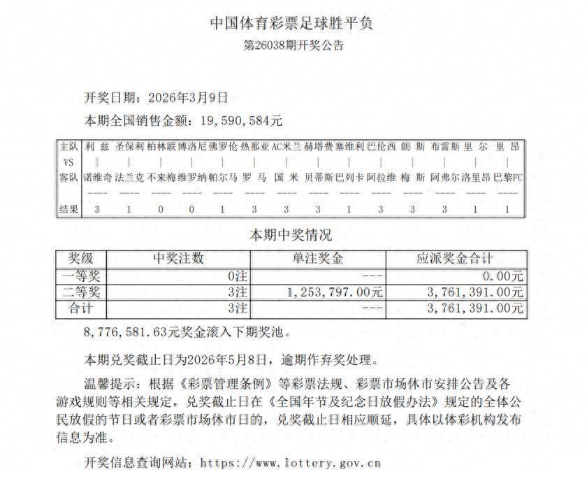วันที่ 9 มีนาคม ตามเวลาปักกิ่ง ประกาศผลสลากกินแบ่งรัฐบาล 26038 งวดที่ผ่านมา แบบทดสอบนี้ประกอบด้วยลีกหลักของยุโรปเช่น Serie A, Bundesliga, La Liga และ Ligue 1 เนื่องจากการระบาดของผลการแข่งขันที่ไม่เป็นที่นิยม แจ็กพอตจึงเปิดอยู่ และเงินรางวัลจะถูกบันทึกไว้ในกลุ่มรางวัลถัดไป