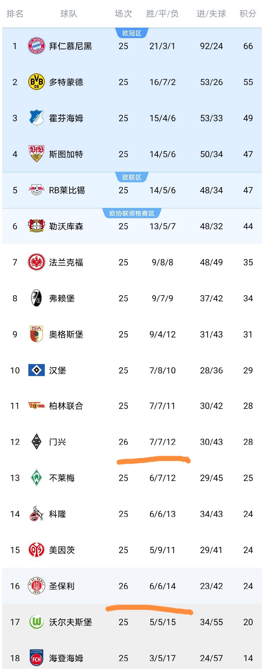 จะเห็นได้ว่าหลังจากโบรุสเซียชนะ คะแนนเพิ่มขึ้นเป็น 28 แต้ม อันดับที่ 12 และหลังจากแพ้ทีมเซนต์เปาลี คะแนนยังคงอยู่ที่ 24 แต้ม อยู่ในอันดับที่ 16 อย่างต่อเนื่อง อาจกล่าวได้ว่าแรงกดดันจากการตกชั้นของ Menxing ลดลงชั่วคราว และทีม St. Pauli ยังคงมีแรงกดดันมากขึ้นในการตกชั้น